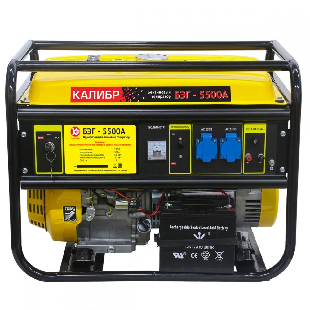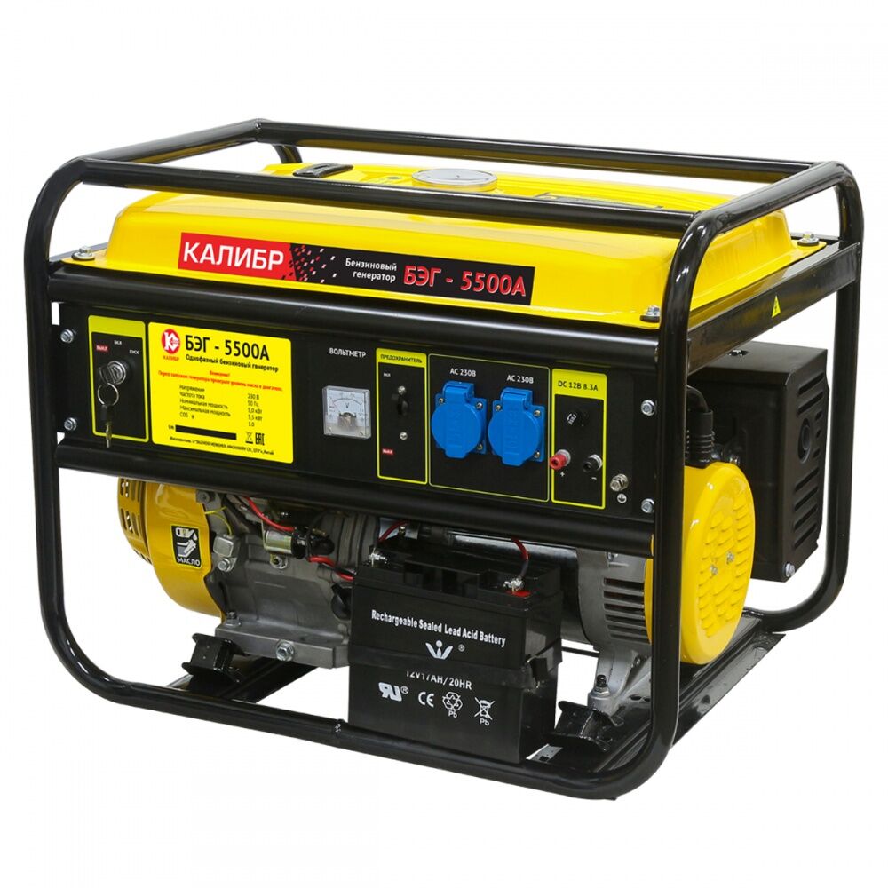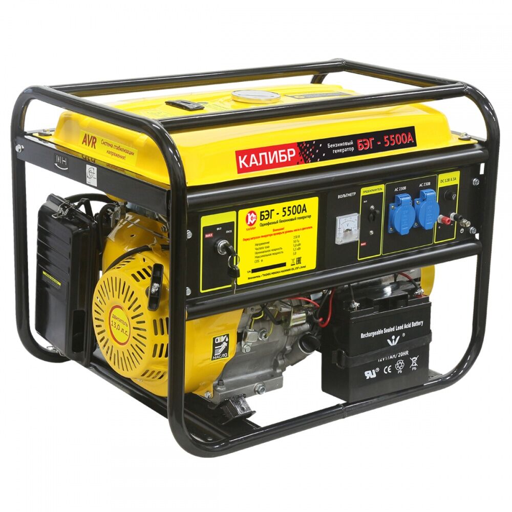 Переносной бензиномоторный электроагрегат с двигателем внутреннего сгорания Калибр БЭГ-5500А предназначен для автономного энегоснабжения, в повторно-кратковременном режиме, потребителей бытовых электроприборов со стандартными характеристиками сети переменного тока: напряжение – 230В, частота – 50Гц. Двигатель работает на неэтилированном бензине АИ-92. Он оснащён мембранным карбюратором и электронной системой зажигания. Для запуска двигателя служит ручной стартёр (бензогенератор комплектуется аккумулятором и замком зажигания электрического стартёра). Вырабатывает постоянный ток напряжением 12В для зарядки кислотных аккумуляторов; электронная система зажигания; индикатор уровня топлива; электростартёр с аккумулятором.