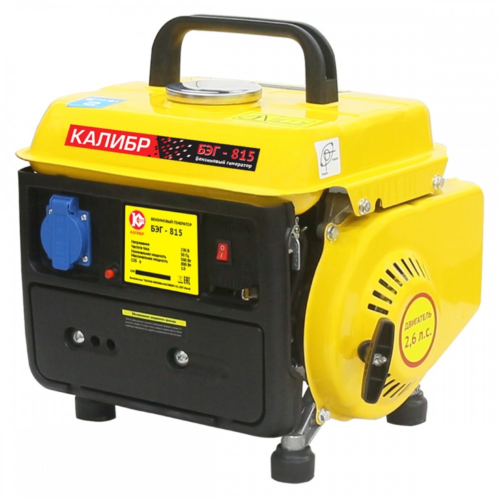 Переносной бензиновый электроагрегат с двигателем внутреннего сгорания. Калибр БЭГ-815 предназначен для автономного энегоснабжения, в повторно-кратковременном режиме, потребителей бытовых электроприборов со стандартными характеристиками сети переменного тока: напряжение – 230В, частота – 50Гц. Двигатель работает на топливной смеси из неэтилированного бензина АИ- 92 и моторного масла для двухтактных двигателей. Он оснащён мембранным карбюратором и электронной системой зажигания. Для запуска двигателя служит ручной стартёр.Вырабатывает постоянный ток напряжением 12В для зарядки кислотных аккумуляторов; электронная система зажигания; ручной стартёр.