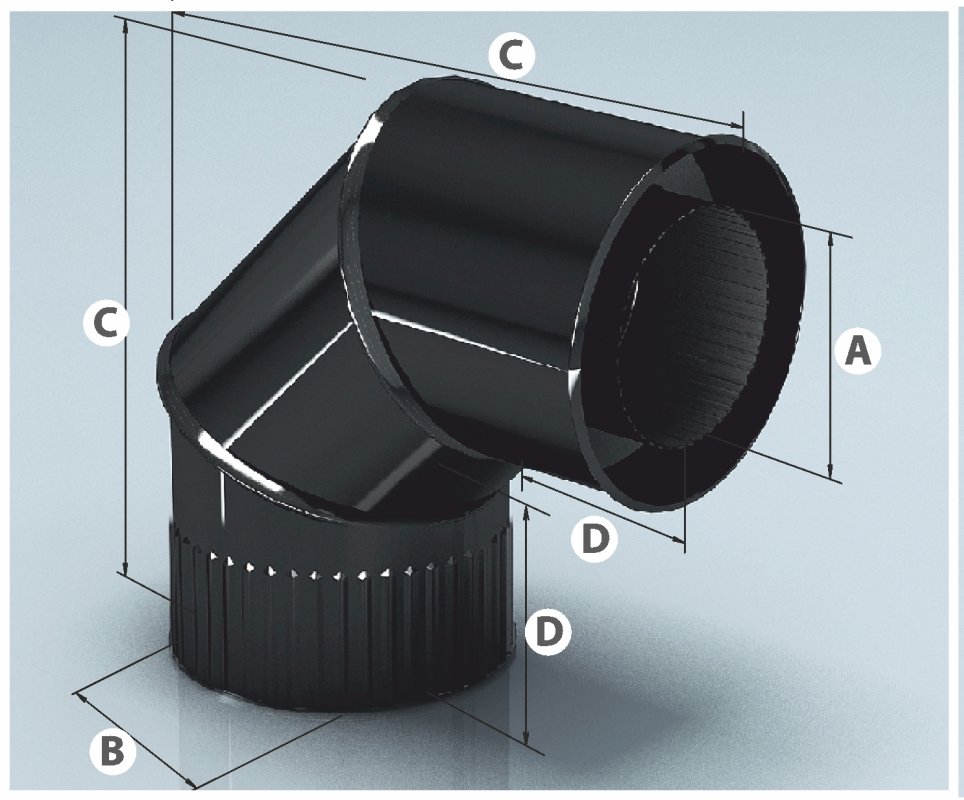 Составной частью дымовой системы, служащей для изменения пути дымового канала, является сэндвич-отвод с углом наклона в 90 градусов. Благодаря таким элементам можно обойти любые помехи на пути дымохода.