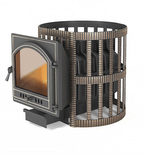 Банная чугунная печь Легенда Ретро 24 Ковка (205) укомплектована чугунной герметичной дверцей Везувий 205 с жаропрочным стеклом «SCHOTT ROBAX» и системой очистки стекла. Конвекционно-вентилируемый кожух "Ковка" изготовлен из металлической текстурированной полосы покрашенной термостойкой краской и покрытая патиной «Бронза».