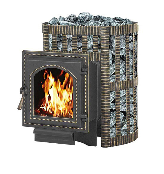 Банная чугунная печь Легенда Ковка 12(220) укомплектована чугунной герметичной дверцей Везувий 220 с жаропрочным стеклом «Schott Robax». Конвекционно-вентилируемый кожух "Ковка" изготовлен из металлической текстурированной полосы покрашенной термостойкой краской и покрытая патиной «Бронза».