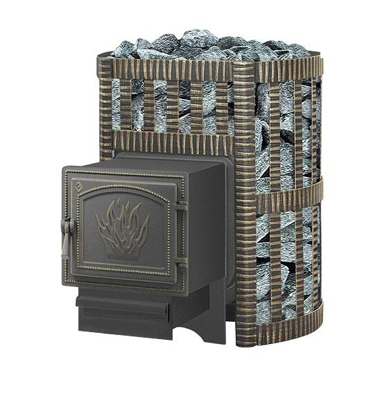 Банная чугунная печь Легенда Ковка 12 (261) укомплектована чугунной герметичной дверцей Везувий 261. Конвекционно-вентилируемый кожух "Ковка" изготовлен из металлической текстурированной полосы покрашенной термостойкой краской и покрытая патиной «Бронза».