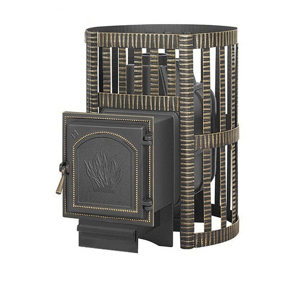 Банная чугунная печь Легенда Ковка 22 (271) укомплектована чугунной герметичной дверцей Везувий 271. Конвекционно-вентилируемый кожух "Ковка" изготовлен из металлической текстурированной полосы покрашенной термостойкой краской и покрытая патиной «Бронза».