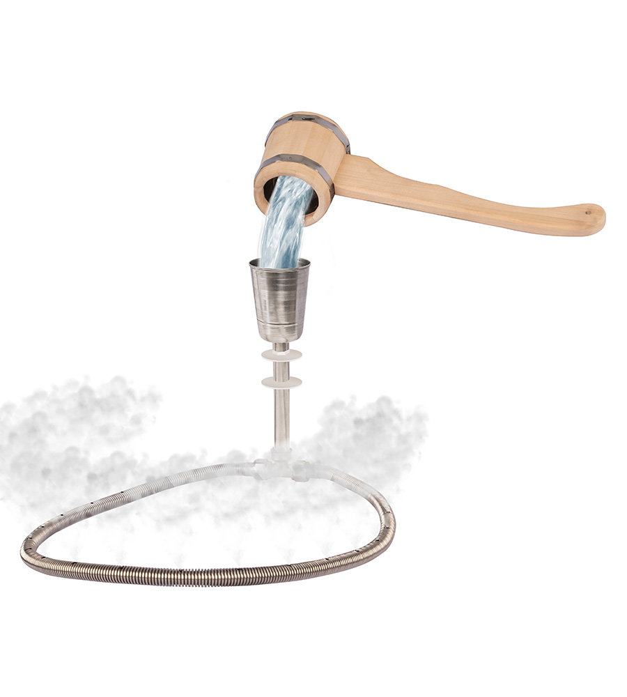 Гибкая часть парогенератора укладывается в каменку среди камней. Небольшие капли воды испаряются практически моментально, за доли секунды превращаясь в пар.