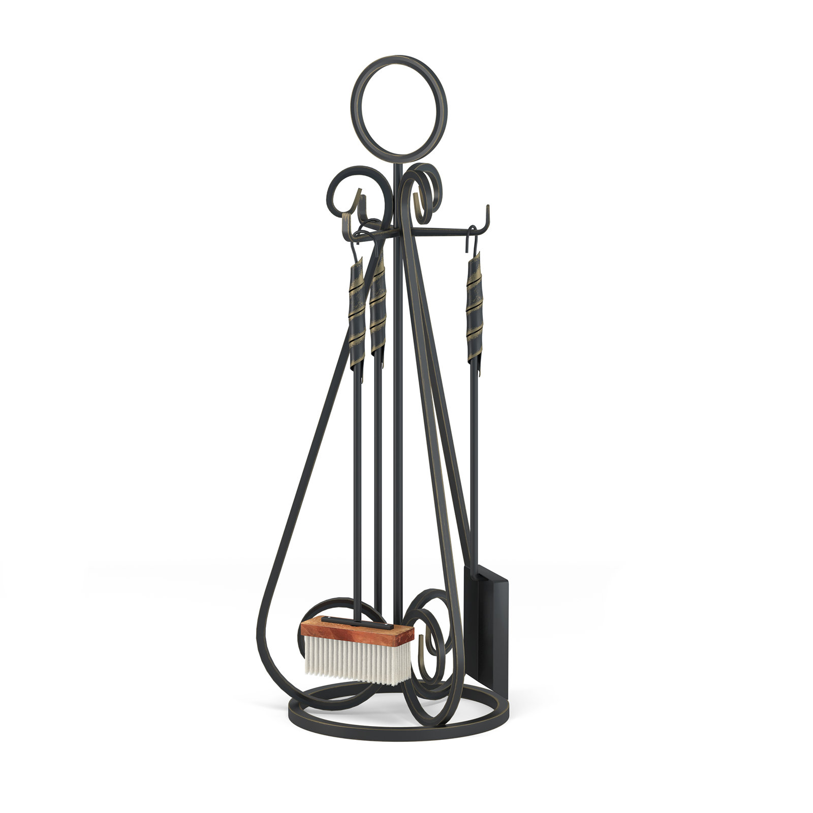 Подставка выполнена в дизайне с округлыми формами, имеет устойчивое основание и три крюка для подвешивания элементов каминного набора.