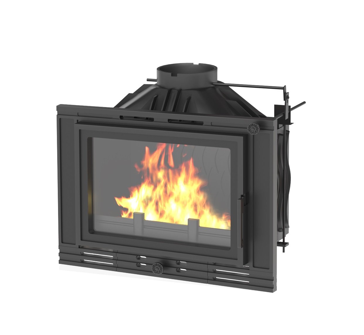 Большая стеклянная дверь дарит возможность любоваться горением огня. Дверь оснащена системой «чистое стекло», что предотвращает образование сажи на стекле при горении дров. Система имеет возможность регулирования подачи воздуха на стекло в верхней части двери. Интенсивность подачи воздуха в топку регулируется заслонкой. Топка оснащена шиберной заслонкой. Удобная ручка управления положением шибера расположена на передней поверхности печи.
