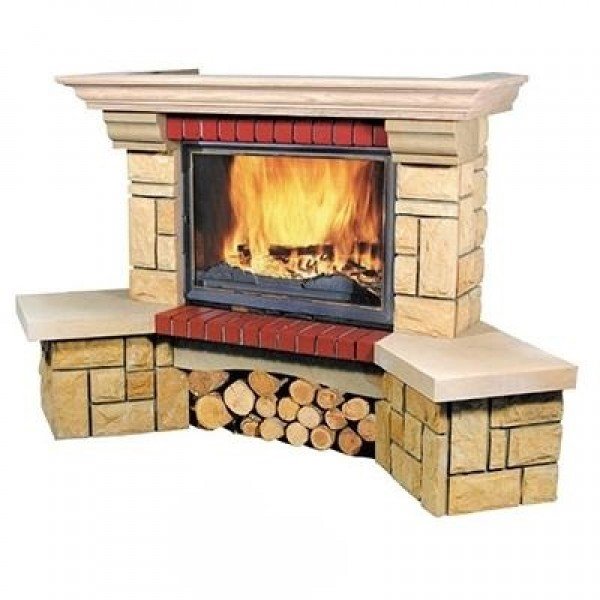 Бюджетная облицовка Bella Italia Marta выполнена в стиле прованс из золотисто-песчаного кварцевого песчаника, топка контрастно обрамлена красно-терракотовым клинкером узкого формата. Основная масса камина сложена из разноформатных колотых блоков. Детали: профилированный карниз, арочка над нишей для дров и плита подиума тщательно отшлифованы, благодаря чему камень приобретает более светлый оттенок. Завершает композицию широкая дубовая каминная полка-карниз.