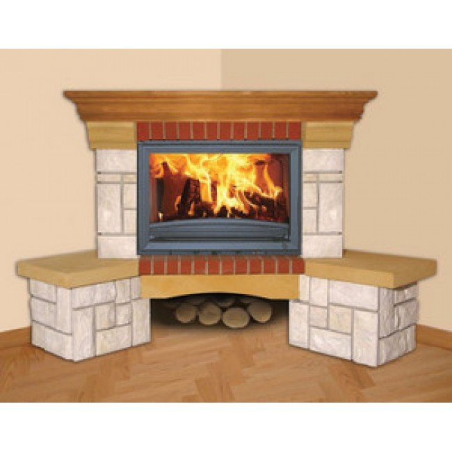 Каминная облицовка выполненная в лучших традициях кантри стиля, предполагает угловой или фронтальный вариант расположения. Классическая облицовка польского бренда напоминает пьедестал, где золотистый отлив колотого мрамора выгодно подчеркивается полированными вставками красновато-бордовых оттенков. Венчает конструкцию рельефная балка из ценных пород древесины, используемая в интерьере в качестве декоративной каминной полки. Выбранная палитра эффектно сочетается с естественной гаммой живого пламени – символа тепла, уюта и настоящего семейного очага.
