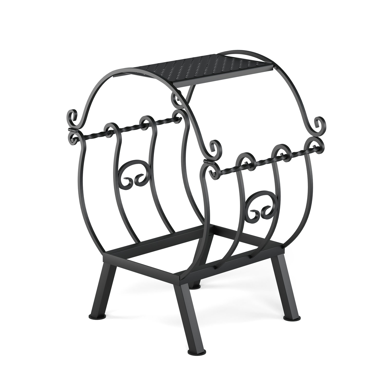 Подставка изготовлена из стального прутка с коваными элементами. Нижний контур и ножки сделаны из квадратного профиля толщиной 25 мм, а в верхней части подставки сделана решётчатая накладка, предназначенная для сушки и обеспечивающая безопасное использование печи.