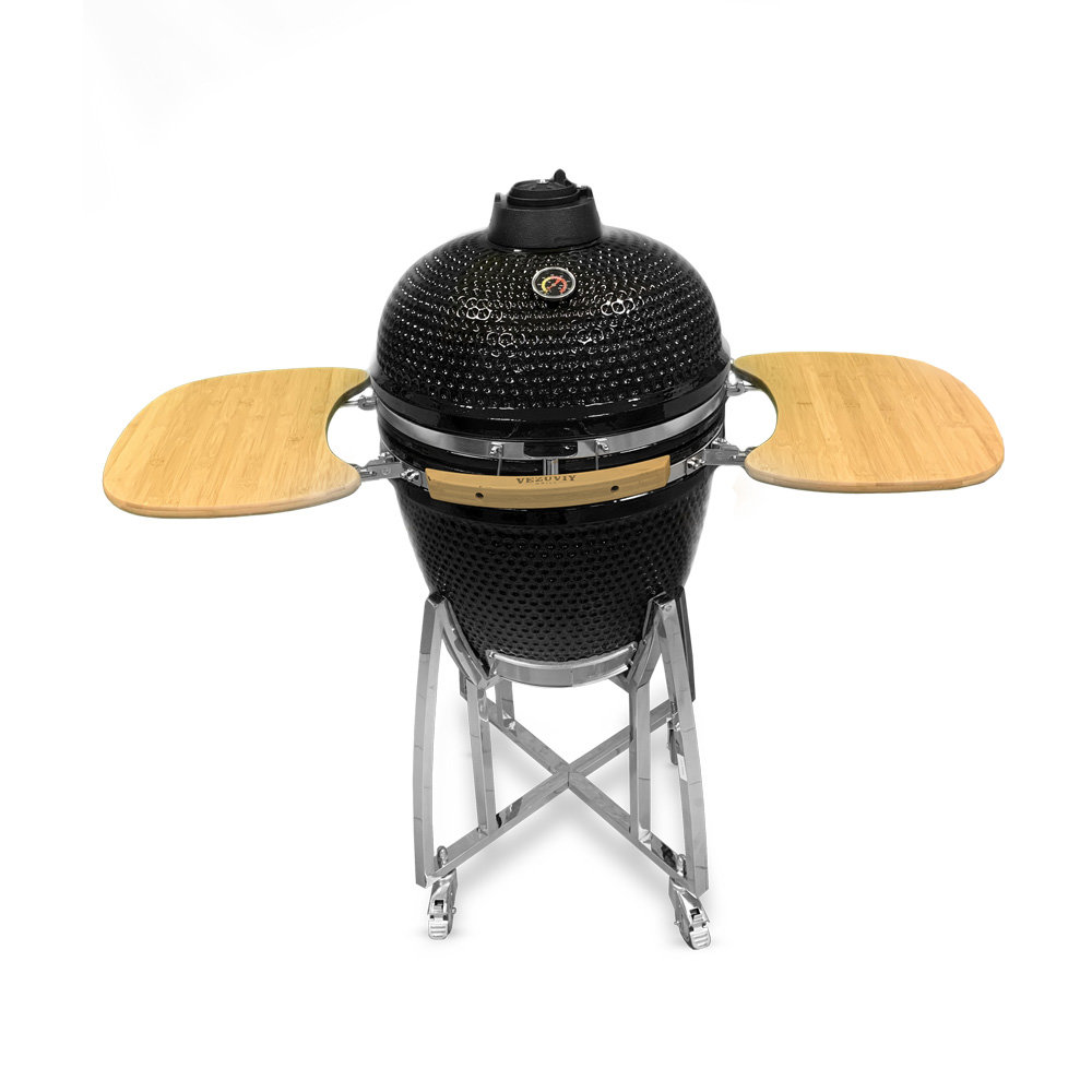Верхние и нижние вентиляционные отверстия позволяют управлять поступающим потоком воздуха для поддержания желаемого жара. Верхний элемент дымоотвода выполнен из чугуна. Керамическая чаша с колосником для древесного угля располагается в основании гриля. На чашу устанавливается высокопрочная нержавеющая стальная решетка. Гриль оборудован термометром, который помогает следить за температурным режимом. Бамбуковая ручка и столешницы делают эксплуатацию гриля максимально удобной и практичной.