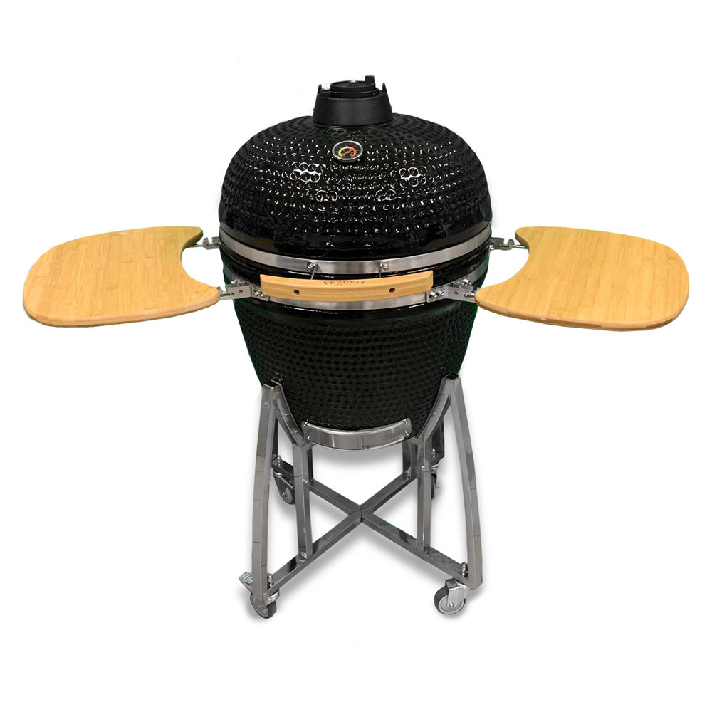Верхние и нижние вентиляционные отверстия позволяют управлять поступающим потоком воздуха для поддержания желаемого жара. Верхний элемент дымоотвода выполнен из чугуна. Керамическая чаша с колосником для древесного угля располагается в основании гриля. На чашу устанавливается высокопрочная нержавеющая стальная решетка. Гриль оборудован термометром, который помогает следить за температурным режимом. Бамбуковая ручка и столешницы делают эксплуатацию гриля максимально удобной и практичной.