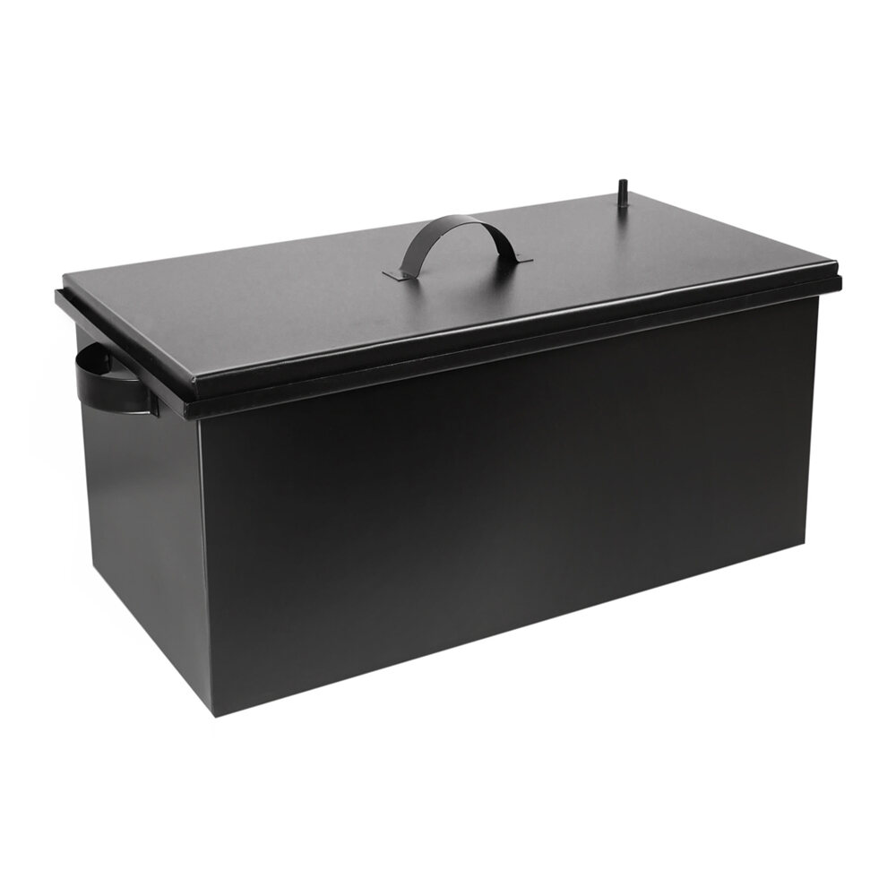 Коптильня изготовлена из нержавеющей стали толщиной 1мм и окрашена черной жаростойкой краской. Имеет 2 уровня для продуктов, поддон для сбора жира и так называемый «гидрозатвор» в верхней части благодаря этому, создается давление и копчение происходит более быстро и качественно.