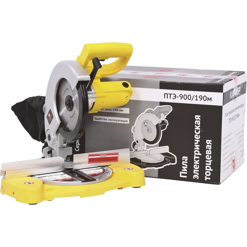 Пила торцевая (торцовочная) электрическая Калибр ПТЭ - 900/190м предназначена для выполнения прямых, косых и наклонных распилов и резов в древесине, ДСП, ДВП, пластмассах в бытовых условиях. Конструкция пилы позволяет осуществлять: распиловку материала под заданным углом (косой рез) относительно задней кромки заготовки в обе стороны и под выставленным углом (до 45 градусов), относительно вертикальной оси влево (наклонный рез). Диск является основным рабочим инструментом для резки выбранных материалов. В комплект поставки входят: пылесборник, щётки графитовые, дополнительные опоры для распиливания длинных заготовок.Защитный кожух;Возможность подключения промышленного пылесоса.Возможность регулирования глубины пропила;Возможность установки заданного угла поворота пильного стола;Возможность установки заданного угла наклона режущего блока.угла наклона режущего блока.