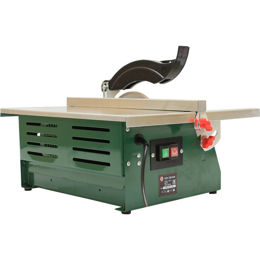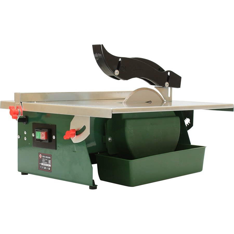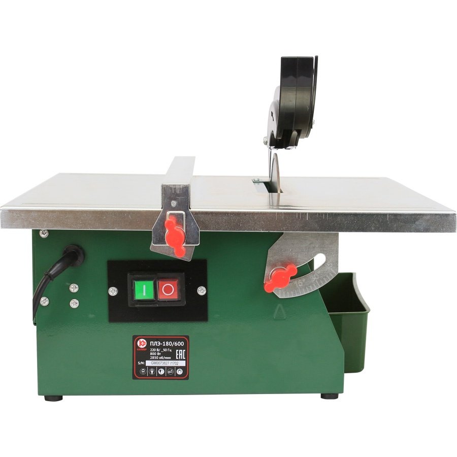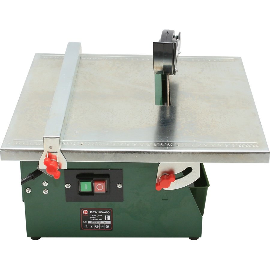 Электрический плиткорез Калибр ПЛЭ-180/600 предназначен для резки с водяным охлаждением всех видов натуральной и искусственной керамической, облицовочной и тротуарной плитки алмазным кругом под прямым углом или под углом до 45° в бытовых условиях. Для установки отрезаемой плитки в нужном положении, на рабочем столе (с двух сторон) нанесена метрическая и дюймовая разметка. Заготовка размещается на рабочем столе в нужном положении с помощью параллельного или углового упоров. Разрезаемая плитка подаётся оператором по рабочему столу к отрезному кругу вручную. Кожух защитный: верхний и нижний;Резка с водяным охлаждением; Регулировка угла наклона рабочего стола.