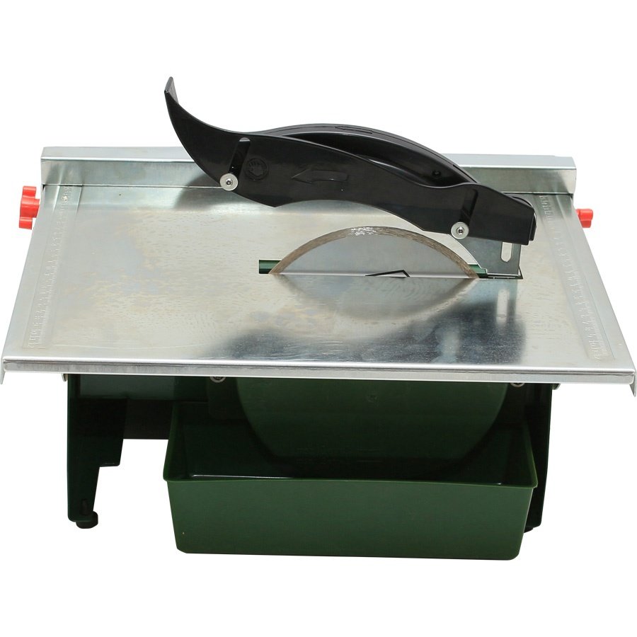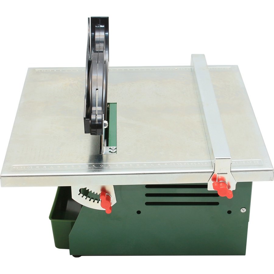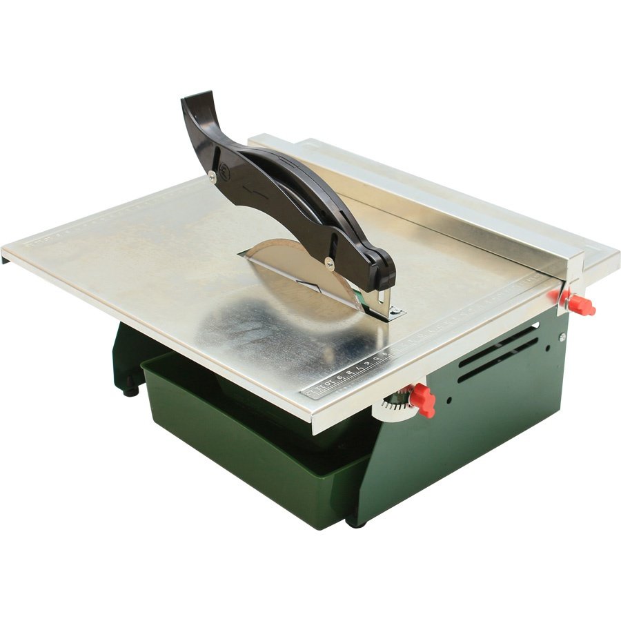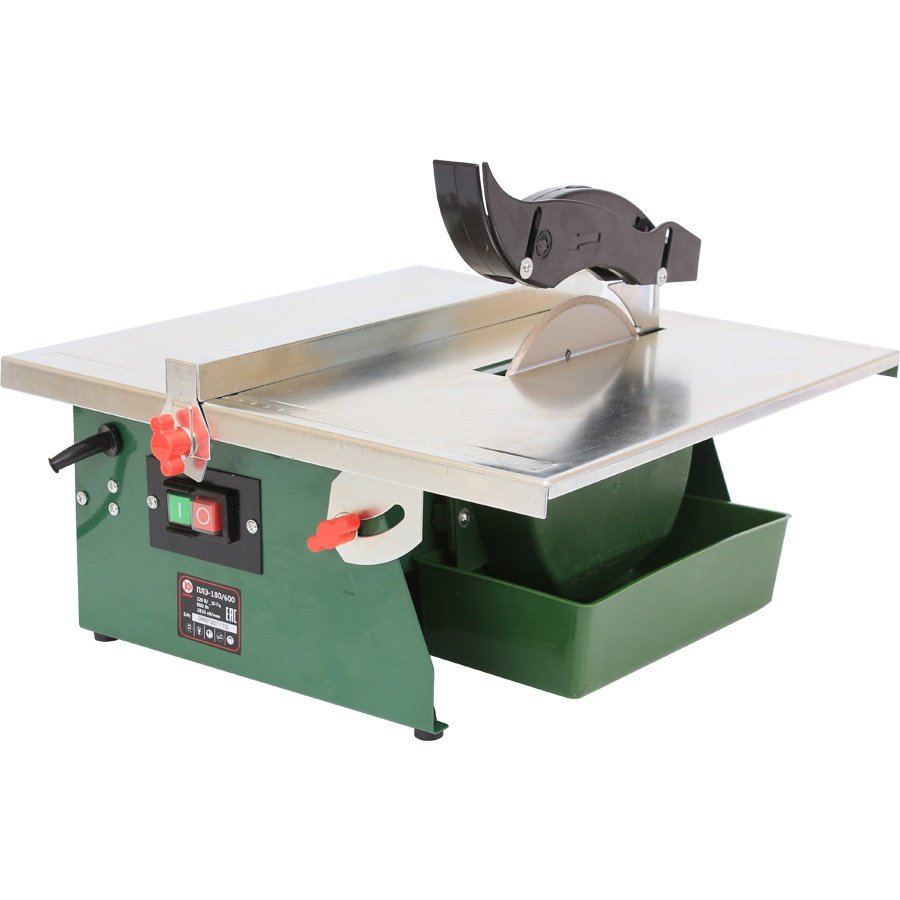Электрический плиткорез Калибр ПЛЭ-180/600 предназначен для резки с водяным охлаждением всех видов натуральной и искусственной керамической, облицовочной и тротуарной плитки алмазным кругом под прямым углом или под углом до 45° в бытовых условиях. Для установки отрезаемой плитки в нужном положении, на рабочем столе (с двух сторон) нанесена метрическая и дюймовая разметка. Заготовка размещается на рабочем столе в нужном положении с помощью параллельного или углового упоров. Разрезаемая плитка подаётся оператором по рабочему столу к отрезному кругу вручную. Кожух защитный: верхний и нижний;Резка с водяным охлаждением; Регулировка угла наклона рабочего стола.