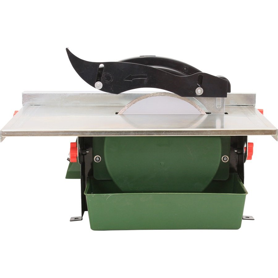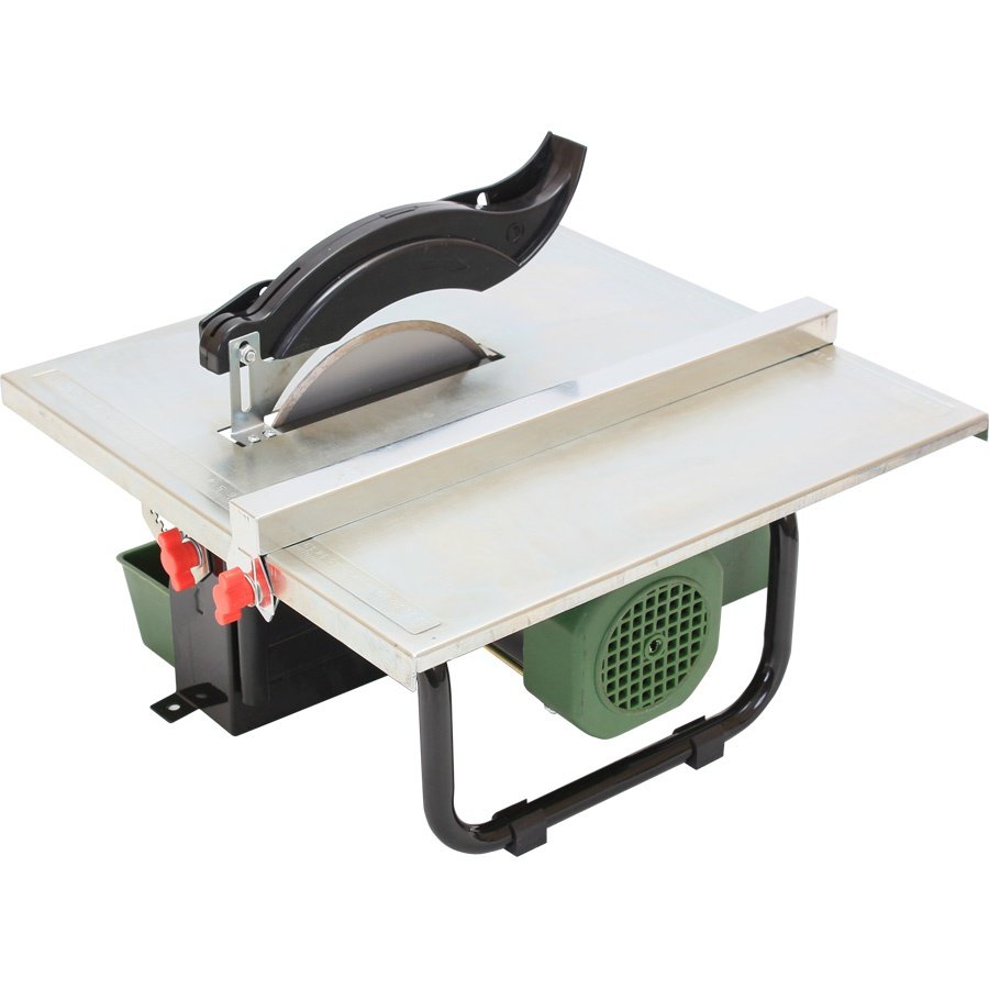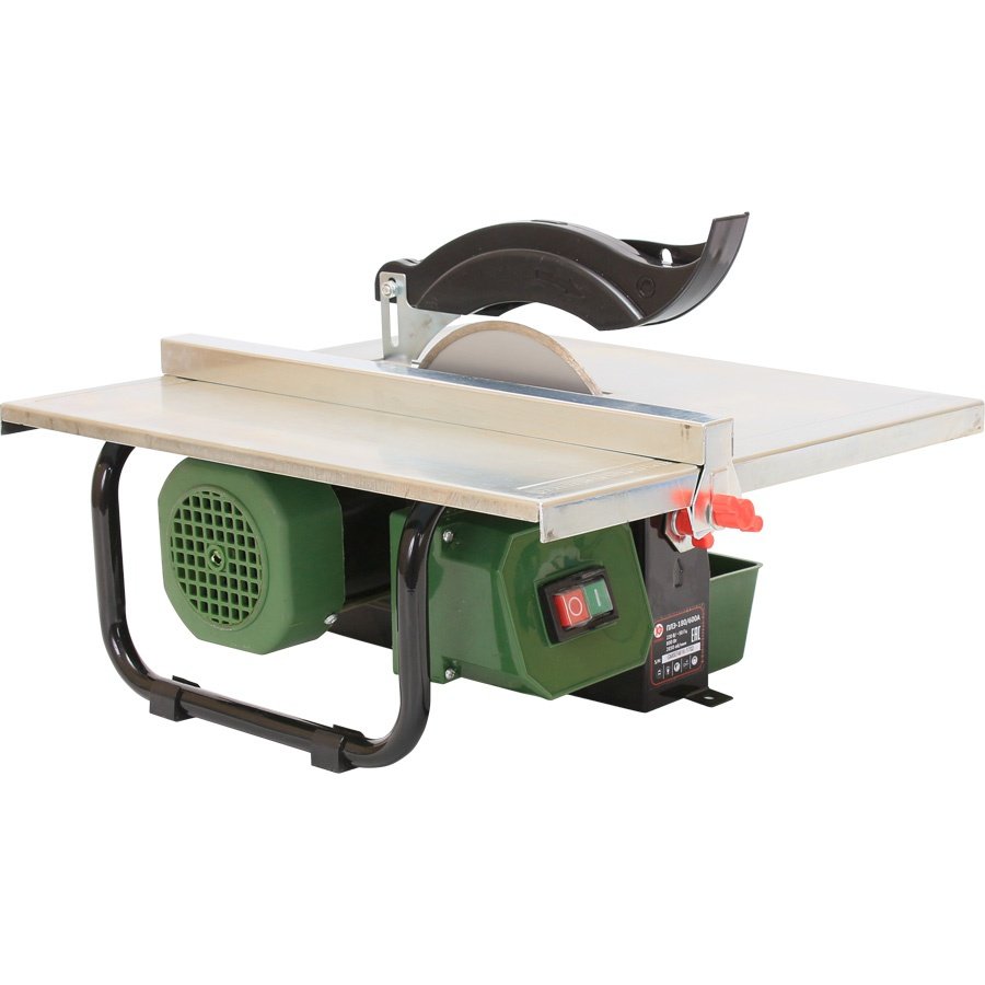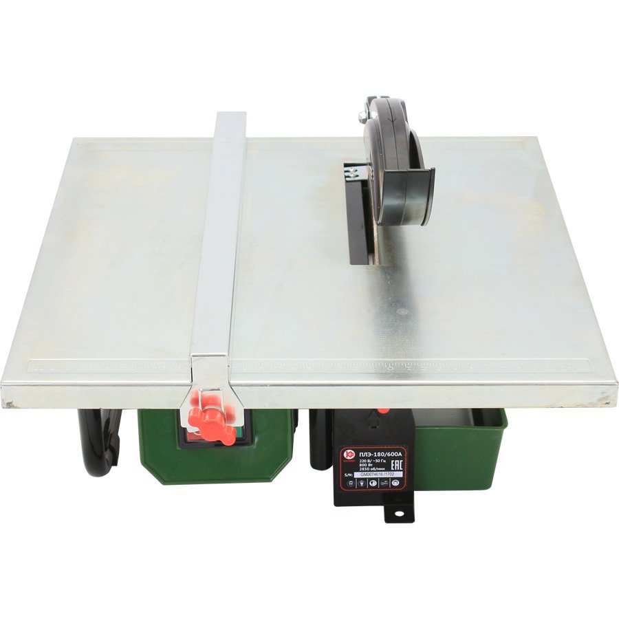 Электрический плиткорез Калибр ПЛЭ-180/600А предназначен для резки с водяным охлаждением всех видов натуральной и искусственной керамической, облицовочной, напольной и тротуарной плитки алмазным кругом под прямым углом или, при изменении угла наклона стола, под углом до 45°. Охлаждение круга во время работы осуществляется погружением его нижней части в поддон с водой. Поддон устанавливается под нижний защитный кожух. На кожух нанесены: стрелка, указывающая направление вращения диска, и риски, отмечающие нижний (min) и верхний (max) уровни охлаждающей воды. Для установки отрезаемой плитки в нужном положении, на рабочем столе (с двух сторон) нанесена метрическая разметка. Заготовка размещается на рабочем столе в нужном положении с помощью параллельного или углового упоров. Раз-резаемая плитка подаётся оператором по рабочему столу к отрезному кругу вручную.Кожух защитный верхний;Резка с водяным охлаждением; Регулировка угла наклона рабочего стола.