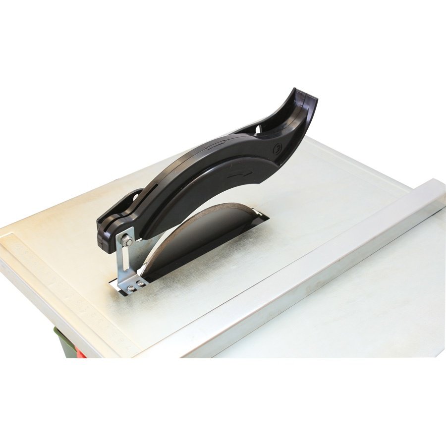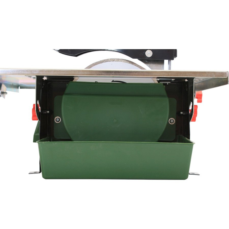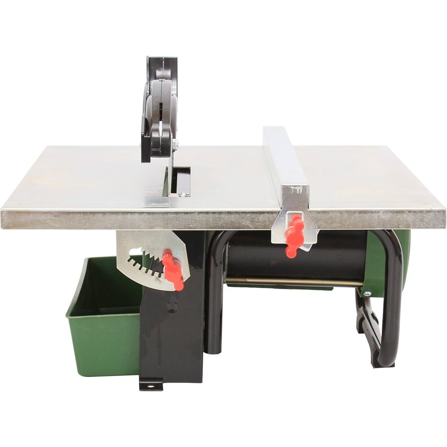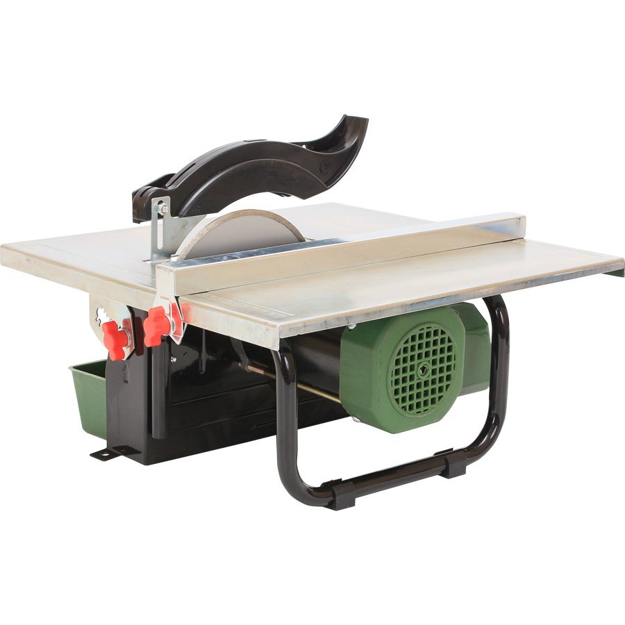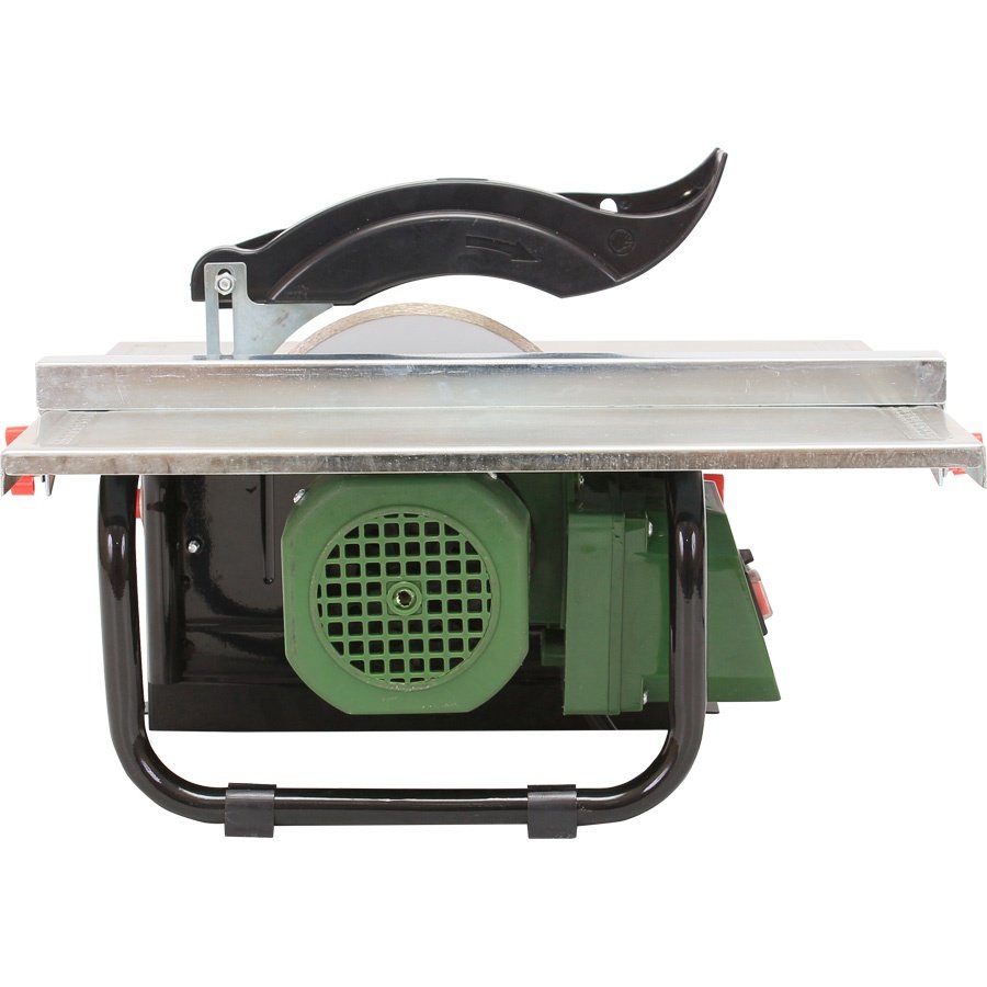 Электрический плиткорез Калибр ПЛЭ-180/600А предназначен для резки с водяным охлаждением всех видов натуральной и искусственной керамической, облицовочной, напольной и тротуарной плитки алмазным кругом под прямым углом или, при изменении угла наклона стола, под углом до 45°. Охлаждение круга во время работы осуществляется погружением его нижней части в поддон с водой. Поддон устанавливается под нижний защитный кожух. На кожух нанесены: стрелка, указывающая направление вращения диска, и риски, отмечающие нижний (min) и верхний (max) уровни охлаждающей воды. Для установки отрезаемой плитки в нужном положении, на рабочем столе (с двух сторон) нанесена метрическая разметка. Заготовка размещается на рабочем столе в нужном положении с помощью параллельного или углового упоров. Раз-резаемая плитка подаётся оператором по рабочему столу к отрезному кругу вручную.Кожух защитный верхний;Резка с водяным охлаждением; Регулировка угла наклона рабочего стола.