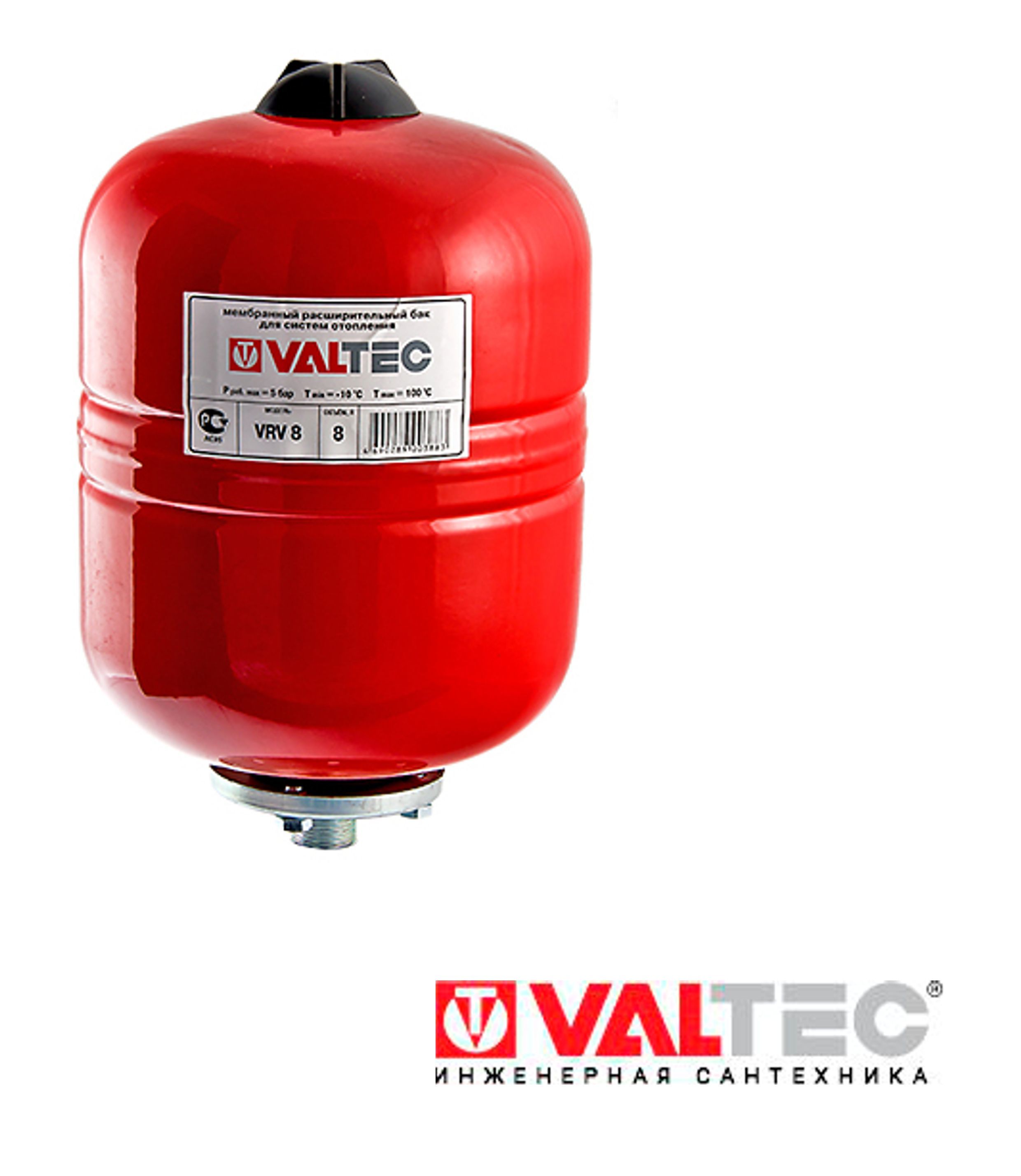 Торговая марка VALTEC предлагает мембранные расширительные баки емкостью от 8 до 150 л. Они оснащены сменной мембраной, выполненной из EPDM (этилен-пропилен-диен-мономер). Это синтетический каучук, который характеризуется эластичностью, температурной и химической устойчивостью, а главное – долговечностью: мембраны из него выдерживают до 100 тыс. циклов динамического нагружения. Материал корпуса – углеродистая сталь. Снаружи мембранные баки для отопления окрашены эпоксидным полиэстером красного цвета.