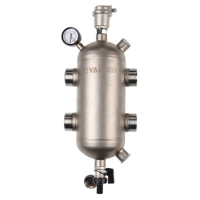 Гидравлическая стрелка из нержавеющей стали комплектуется манометром, дренажным клапаном, автоматическим воздухоотводчиком с отсекающим клапаном. На корпусе предусмотрены резьбовые патрубки для дополнительной установки датчика температуры, термометра, магнитного шламоуловителя. Патрубки заглушены резьбовыми пробками.