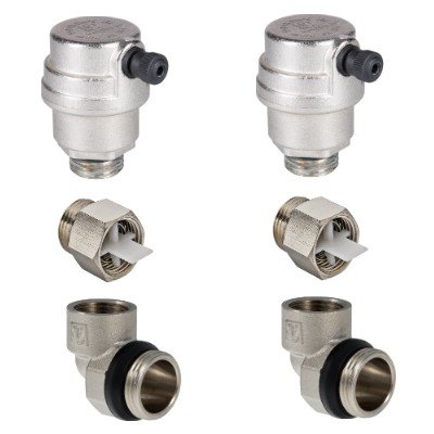 Комплект автоматических воздухоотводчиков на подающий и обратный коллекторы этажных узлов для поквартирного учета тепловой энергии с перепускным клапаном VT.GPR. Опция, базовые модели узлов укомплектованы ручными воздухоотводчиками. Набор включает в себя воздухоотводчики VT.502.NH.04 (присоединительный размер – 1/2”), отсекающие клапаны VT.539.N.04 (1/2”), коллекторные отводы VTc.531.N.0604 (1" x 1/2") – по 2 ед. каждого изделия.