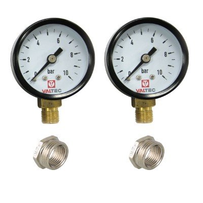 Комплект манометров (опция) на подающий и обратный коллекторы этажных узлов для поквартирного учета тепловой энергии. Включает в себя два манометра VT.TM50.D (нижнее подключение, диапазон показаний давления – 0–10 бар, диаметр корпус – 50 мм), а также два резьбовых фитинга VTr.581.N0402 (футорка 1/2" х 1/4").