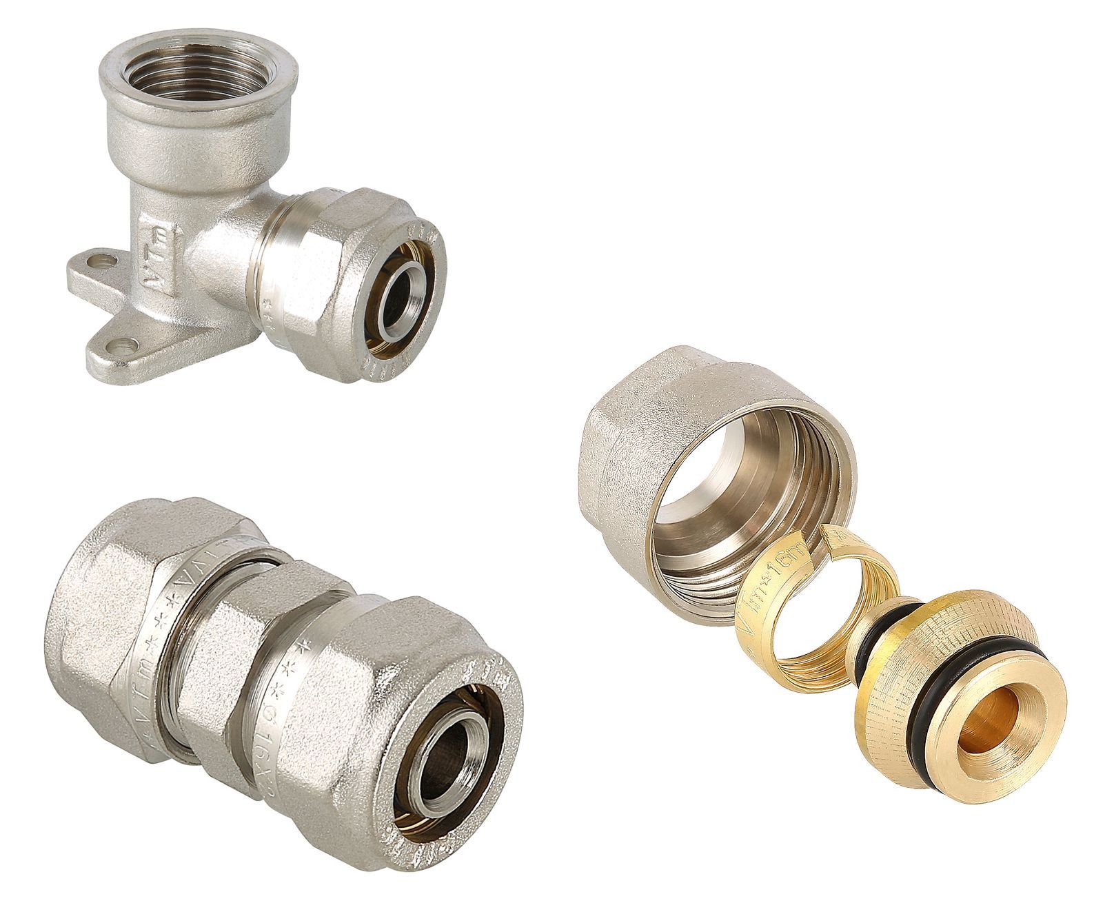 Обжимные фитинги предназначены для соединения металлопластиковых (металлополимерных) труб, а также для присоединения этих к труб к трубопроводной арматуре. Материалами для их производства служат сантехническая латунь CW617N (корпус, накидная гайка), модифицированная упрочняющими присадками синтетическая резина EPDM (уплотнители), PTFE (диэлектрическая прокладка).