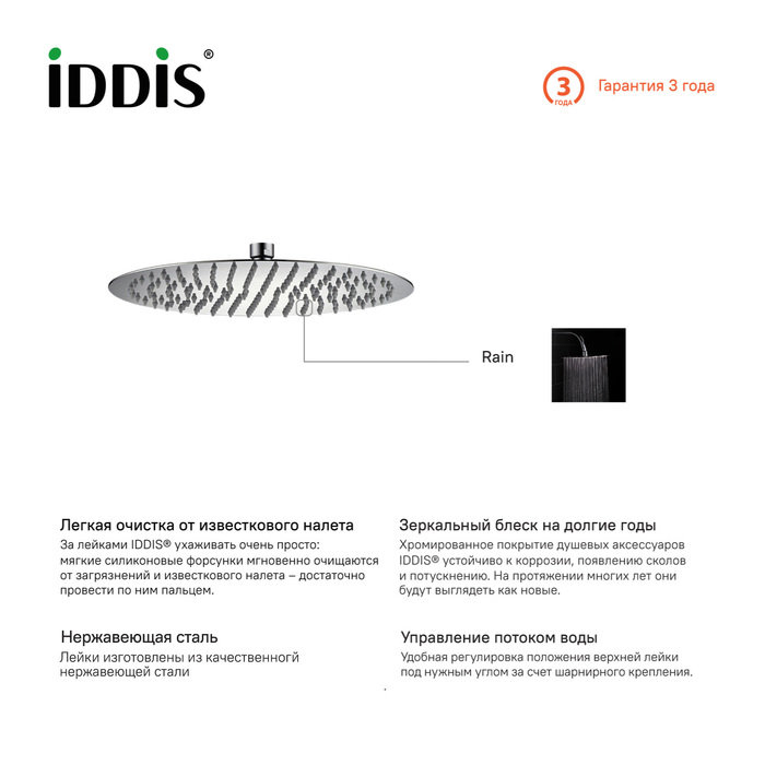 • Хромированное покрытие душевой лейки IDDIS® устойчиво к коррозии, появлению царапин, сколов и потускнению. На протяжении многих лет она будут выглядеть как новая.