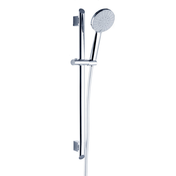 Душевой гарнитур. Лейка с 5 режимами (Rain, Massage, Mist, Rain&Massage, Aquastop), диаметр 115 мм. Верхнее крепление стойки регулируется по высоте. Шланг: нержавеющая сталь, 1,5 метра, с cистемами Twist-Free и Double Lock. Высота стойки: 694 мм. В комплекте: крепеж.