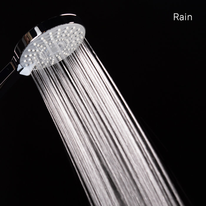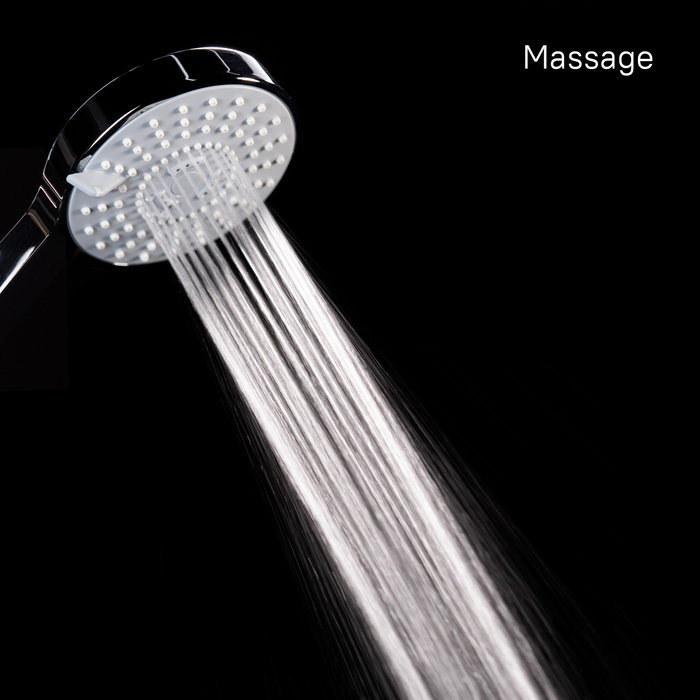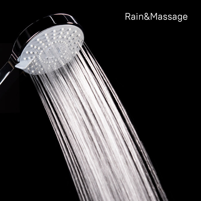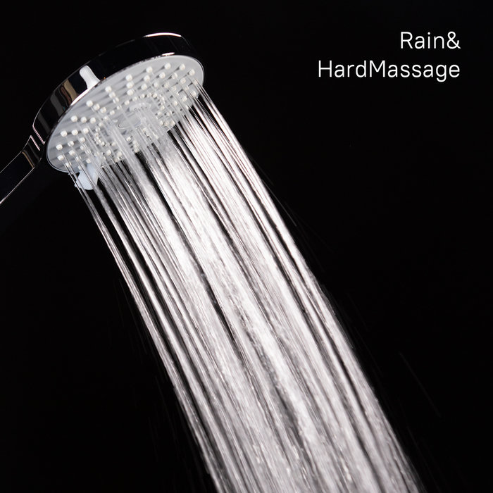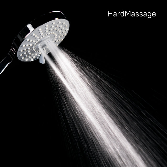 Душевой гарнитур. Лейка с 5 режимами (Rain, Massage, Rain&Massage, Hard massage, Hard massage&Rain), диаметр 108 мм. Верхнее крепление стойки регулируется по высоте. Шланг: нержавеющая сталь, 1,5 метра, с cистемами Twist-Free и Double Lock. Высота стойки: 685 мм. В комплекте: мыльница. кольцо для фиксации шланга, крепеж.