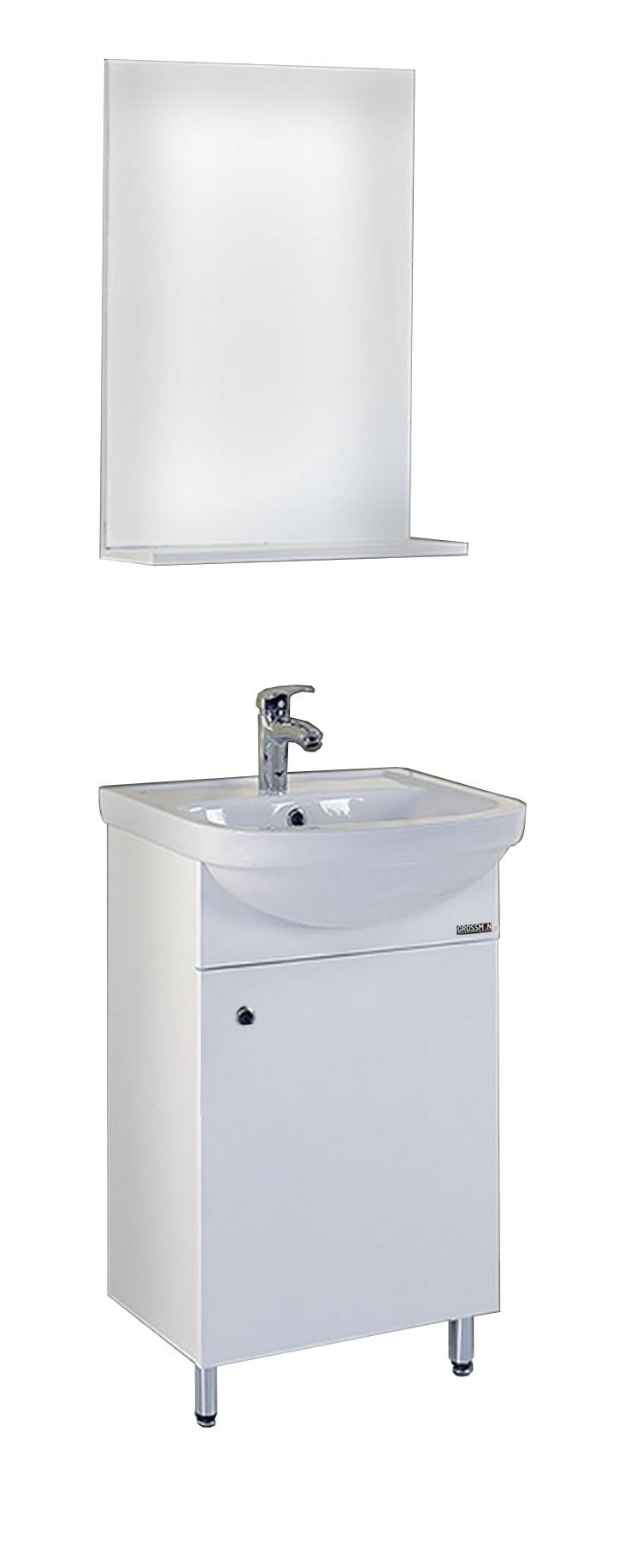 Тумба и зеркало с полочкой изготовлены из ЛДСП, устойчивой к механическим воздействиям, перепадам температур и высокой влажности.