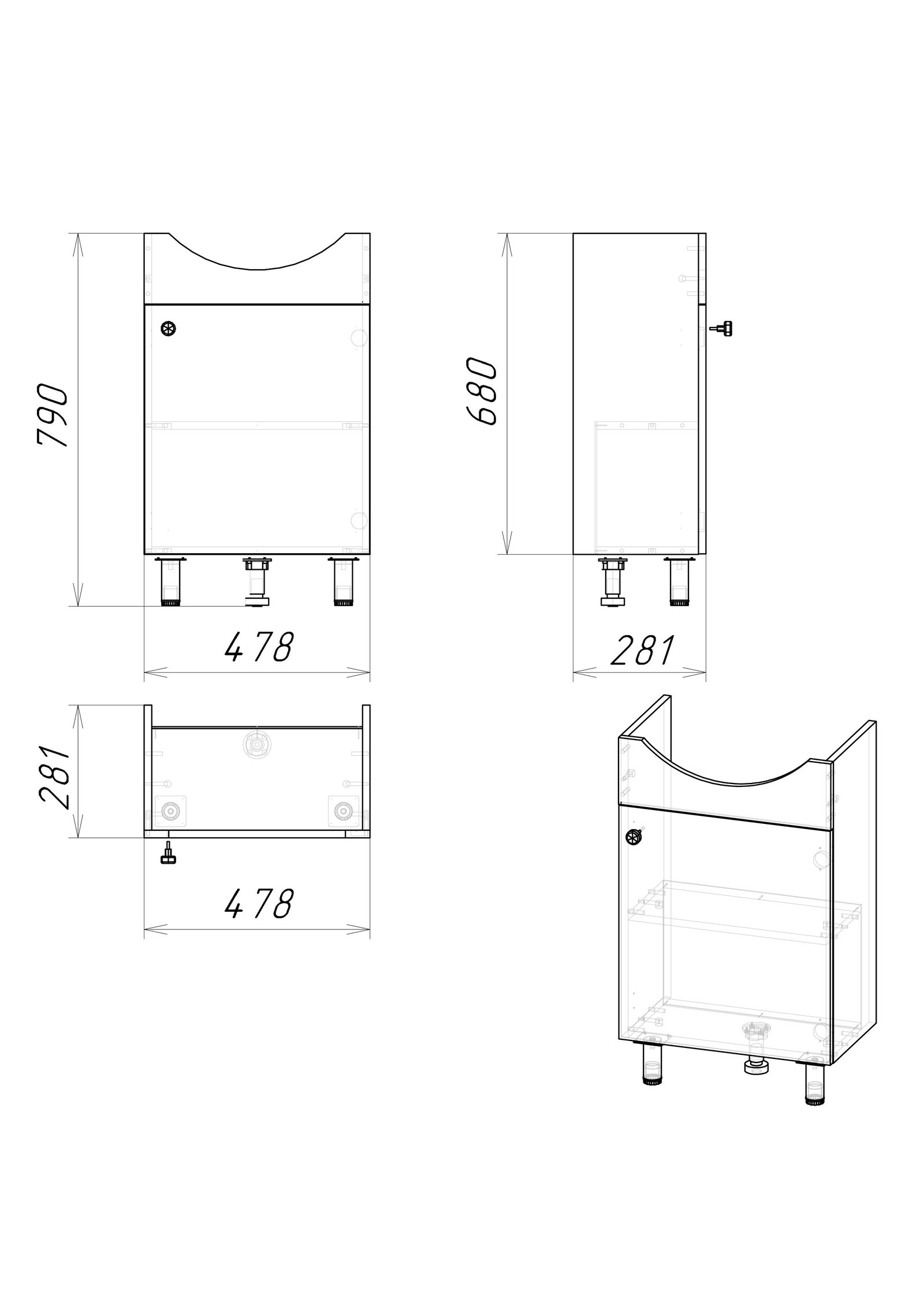 Одна хромированная ручка и три ножки (2 декоративных хромированных и 1 пластиковая), Раковина Акватон-52 см идут в комплекте с тумбой.