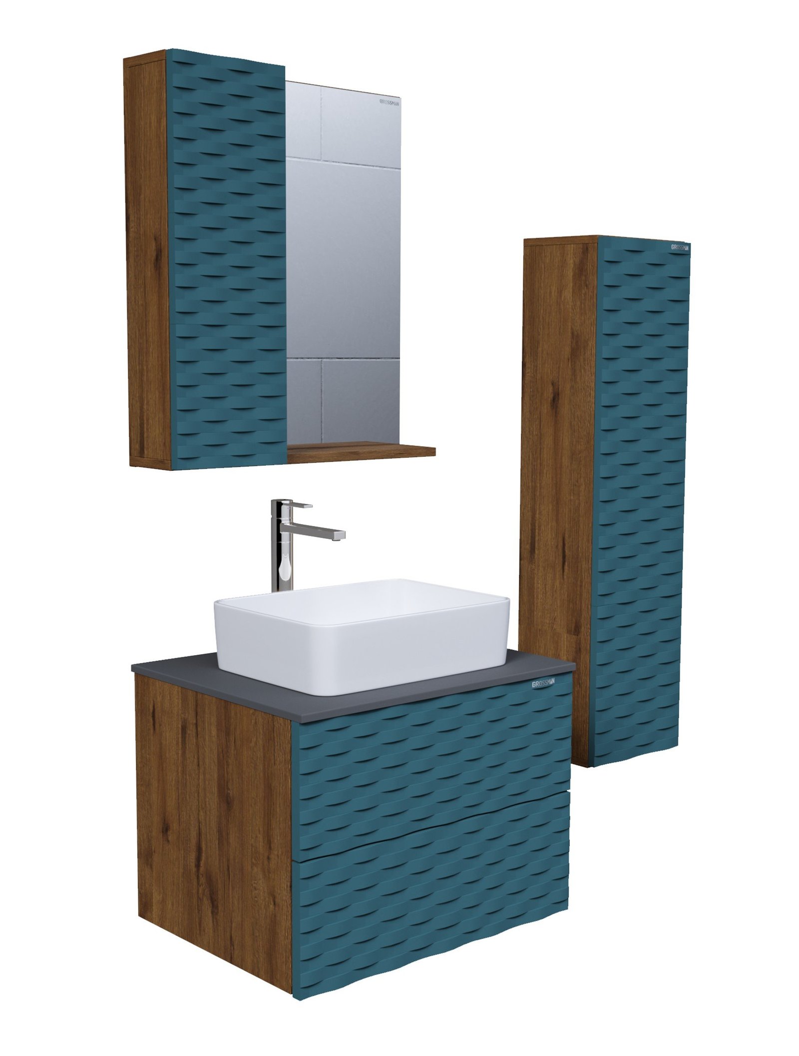 Шкаф-зеркало Альба-65 см отражает современные тенденции в дизайне мебели для ванных комнат: матовая пленка в цвете Бриз с 3D рисунком безупречно сочетается с текстурой под дерево , отсутствие лишних деталей.