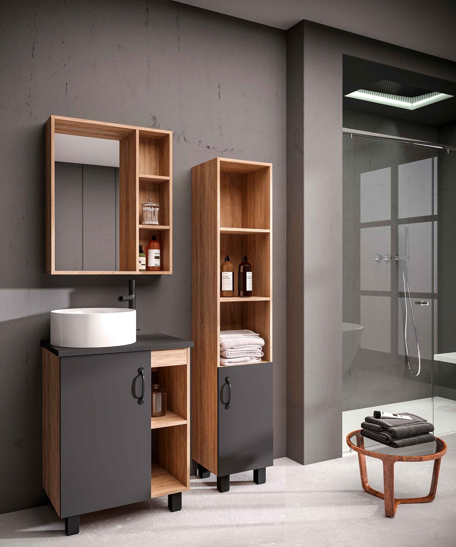 Столешница Флай 60 cм выполнена из МДФ: серая матовая пленка с покрытием SoftTouch придаст современный вид и позволит установить накладную раковину. Отверстие под смеситель в правом углу