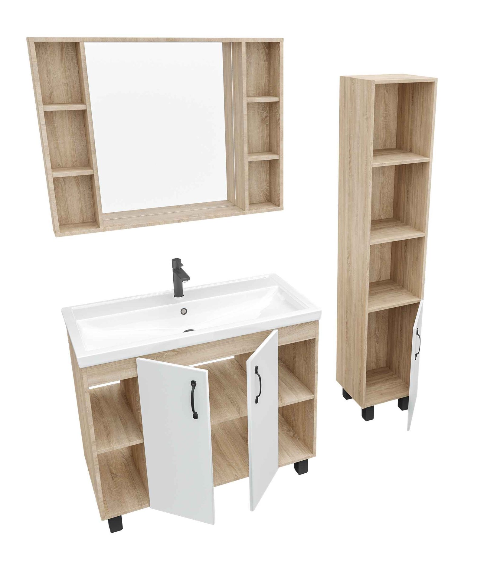 Зеркало Флай 100 см отражает современные тенденции в дизайне мебели для ванных комнат: минимализм с простыми и понятными формами, цвета дуба с текстурой, отсутствие лишних деталей.