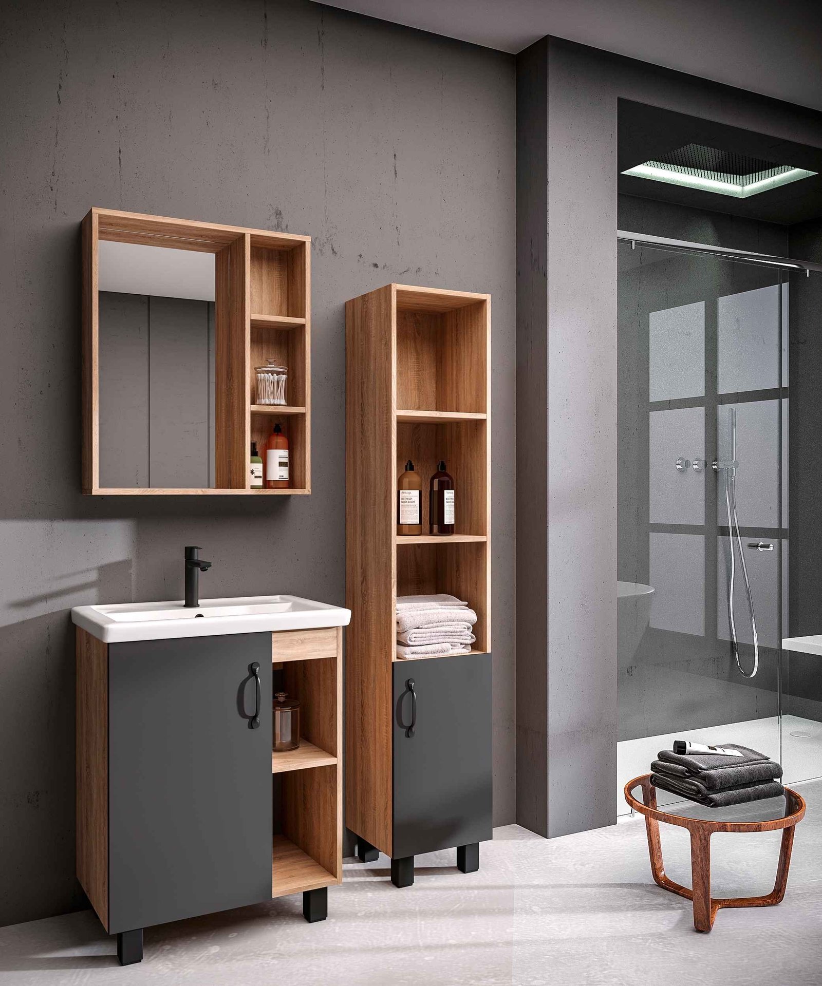 Зеркало Флай 60 см отражает современные тенденции в дизайне мебели для ванных комнат: минимализм с простыми и понятными формами, цвета дуба с текстурой, отсутствие лишних деталей.
