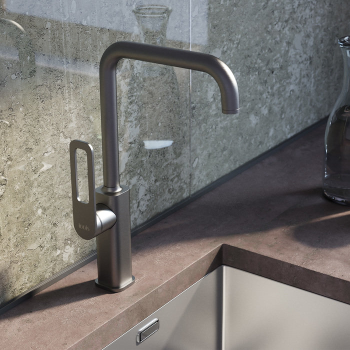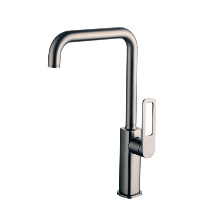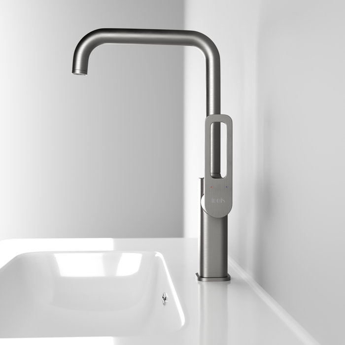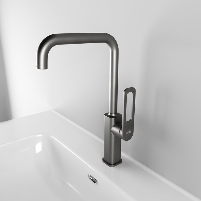 Высокий смеситель для кухни Slide в стильном оттенке графит. Удобная ручка поворачивается на себя, не касаясь стены, что позволит установить смеситель на любом расстоянии от стены. Отверстие-петля на ручке выполняет декоративную и при этом практичную роль — ее легко захватить даже намыленной рукой и отрегулировать напор или температуру. Благодаря высокому изливу смеситель будет удобен в использовании даже с неглубокой мойкой, а за счет высокого основания может использоваться с накладными умывальниками, в том числе, в ванной.