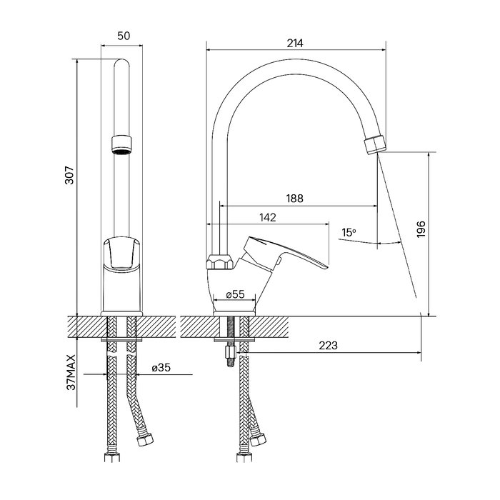 Высокий смеситель (высота излива – 307 мм) для кухни Ray имеет универсальный дизайн и подойдет для различных вариантов интерьерных решений. Благодаря поворотному изливу пользоваться им удобно на любой кухонной мойке. Может быть установлен как на мойку, так и на столешницу.