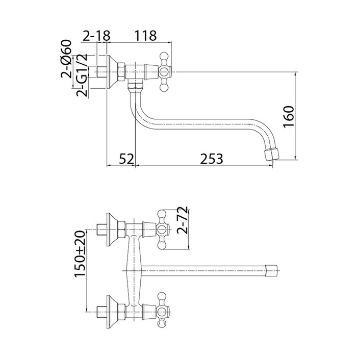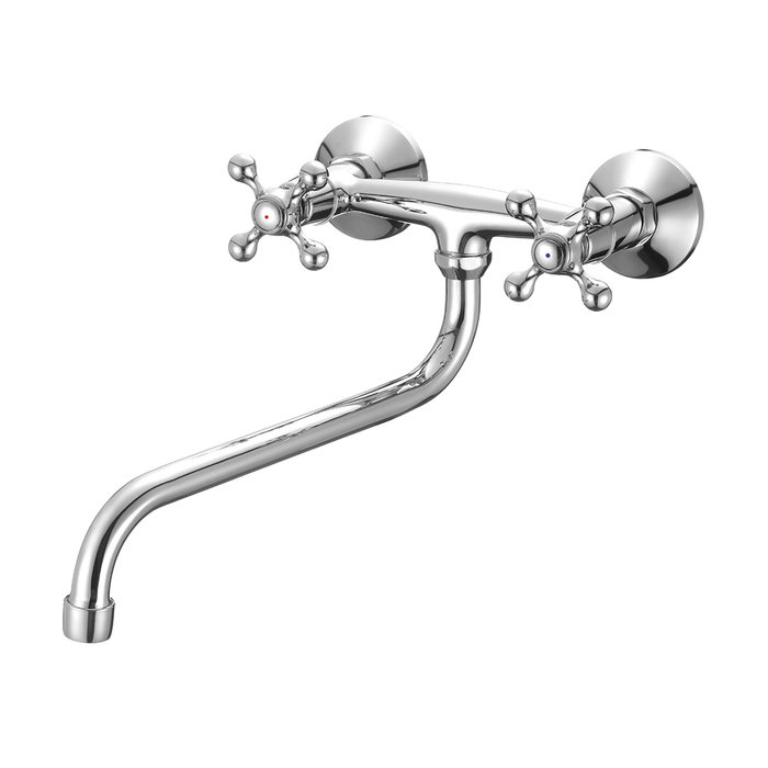 Смеситель для кухни, двухзахватный, латунь,никель-хромовое покрытие, цвет - хром, керамические кранбуксы, пластиковый аэратор. В комлекте: гибкая подводка, крепёж. Упаковка: коробка, микрогофрокартон, индивид. мешок.