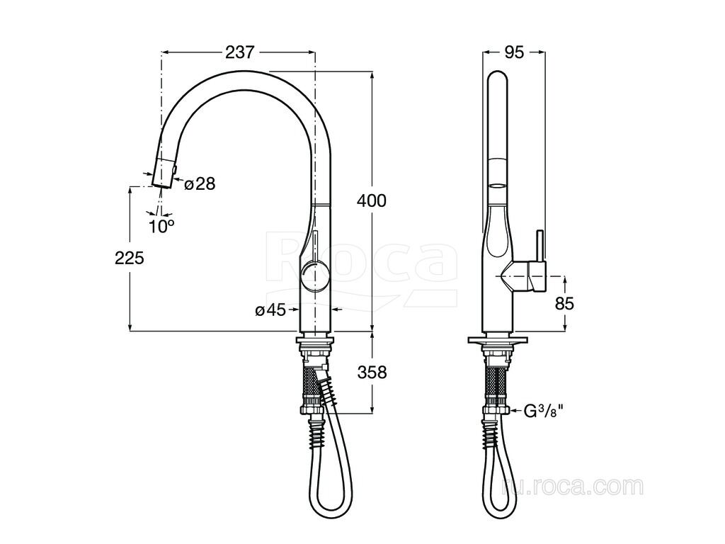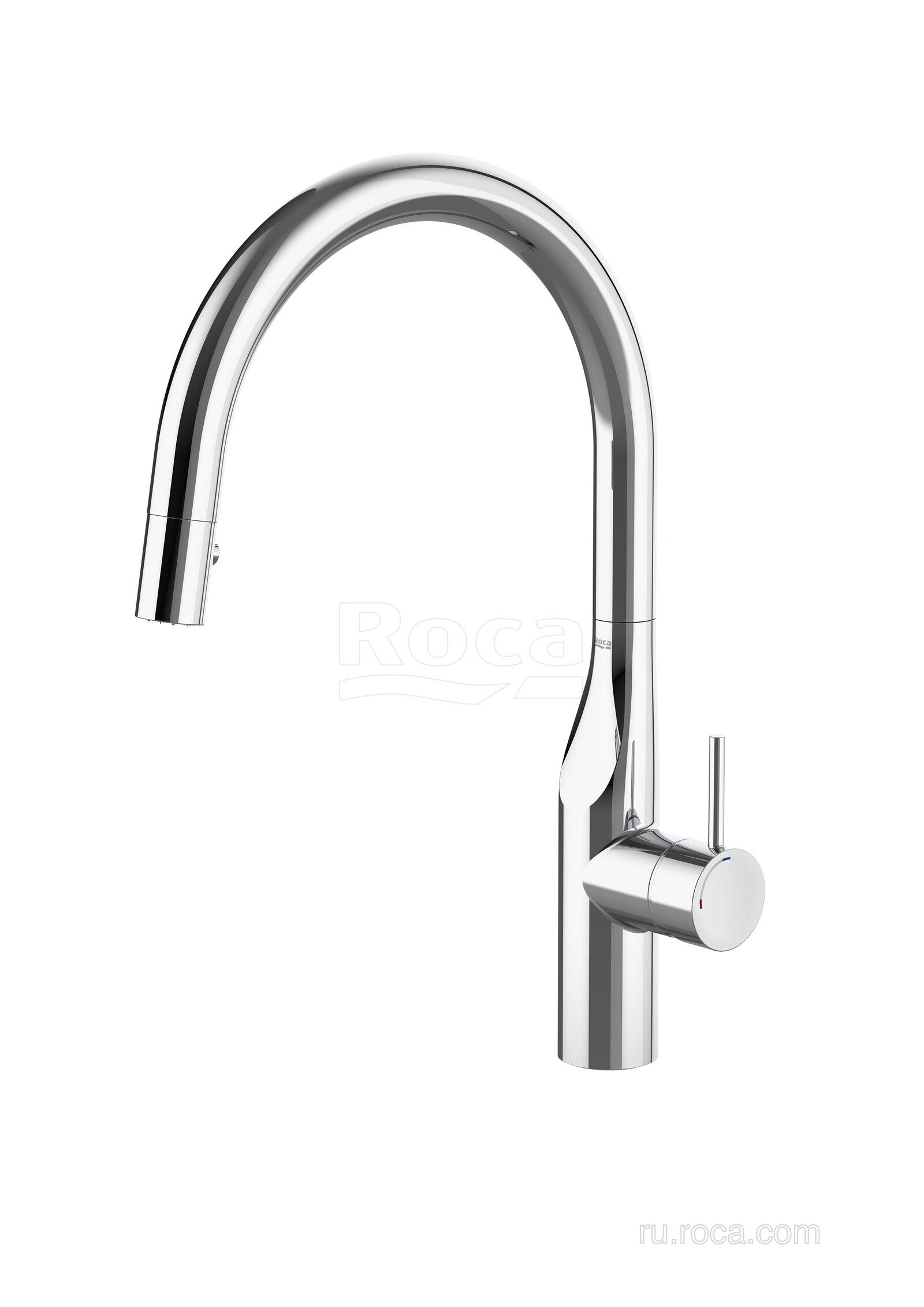 Roca Glera Смеситель однорычажный для кухни с выдвижным 2-х режимным душем, поворотный U-образный излив, хром