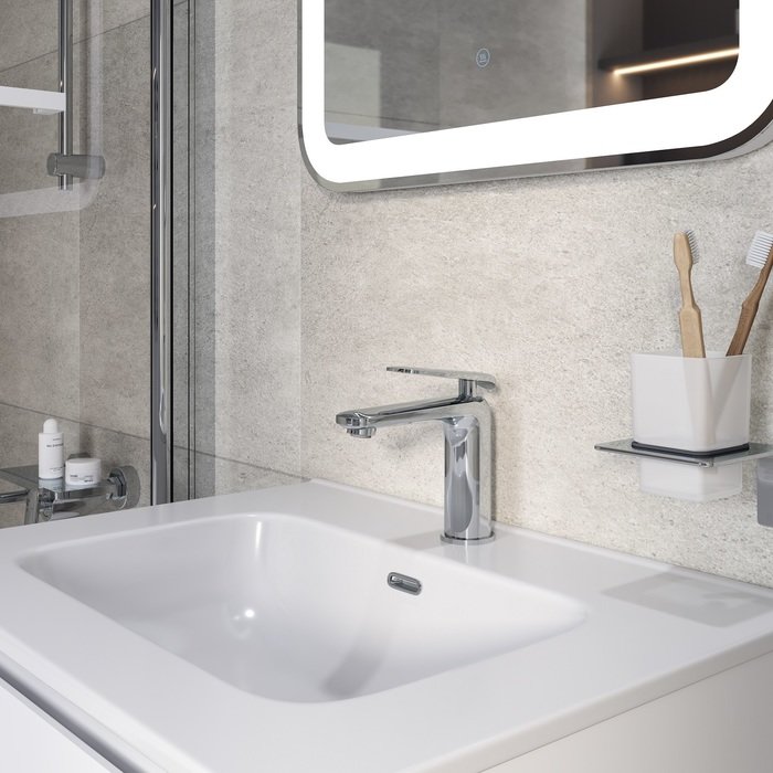 Смеситель для умывальника Dash моментально приковывает взгляд своим монолитным корпусом и оригинальным дизайном. Необычен не только внешний вид, но и ручка управления смесителем – стильная и эргономичная, она удобно ложится в руку, делая управление более комфортным. Смеситель будет органично смотреться в интерьере в стиле минимализм или модерн, его также можно удачно обыграть и в интерьере классической ванной.