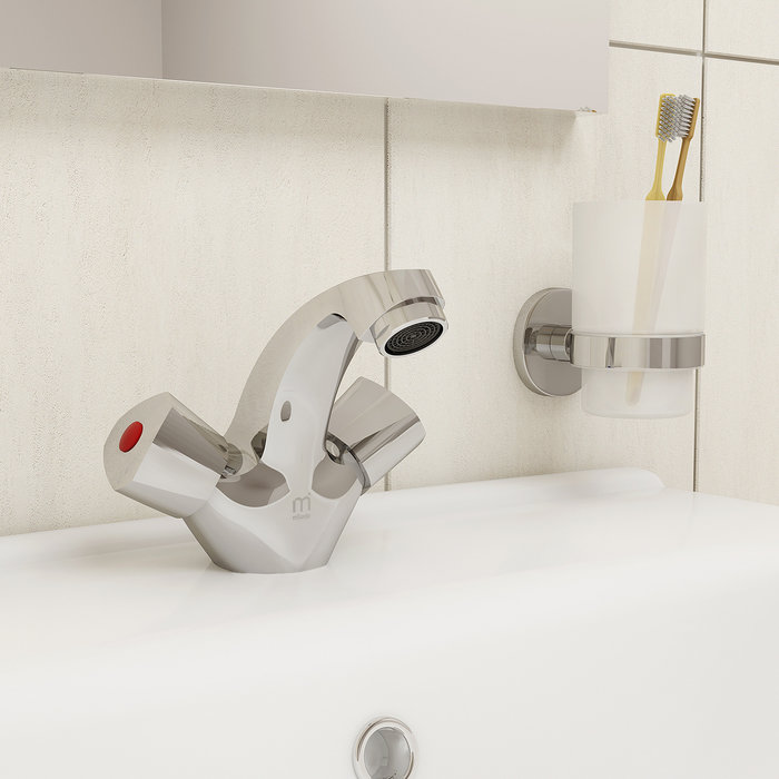 Компактный (всего 111 мм в высоту) смеситель для умывальника Tring с удобными ручками классической треугольной формы. Угол поворота ручек 180о обеспечивает точную регулировку температуры и напора воды, а термоизоляция не позволяет им нагреваться – взрослые и особенно дети защищены от случайных ожогов. Надежный фиксированный излив подойдет для неглубоких раковин.