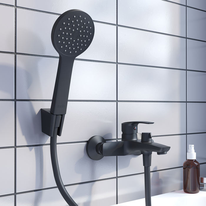 Смеситель для ванны Ray имеет универсальный дизайн и благодаря актуальному матовому черному цвету станет ярким акцентом современного интерьера ванной. В комплекте однорежимная лейка для душа, ПВХ-шланг и настенный держатель для лейки – все в тон смесителя.