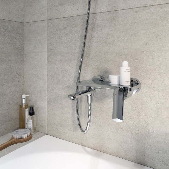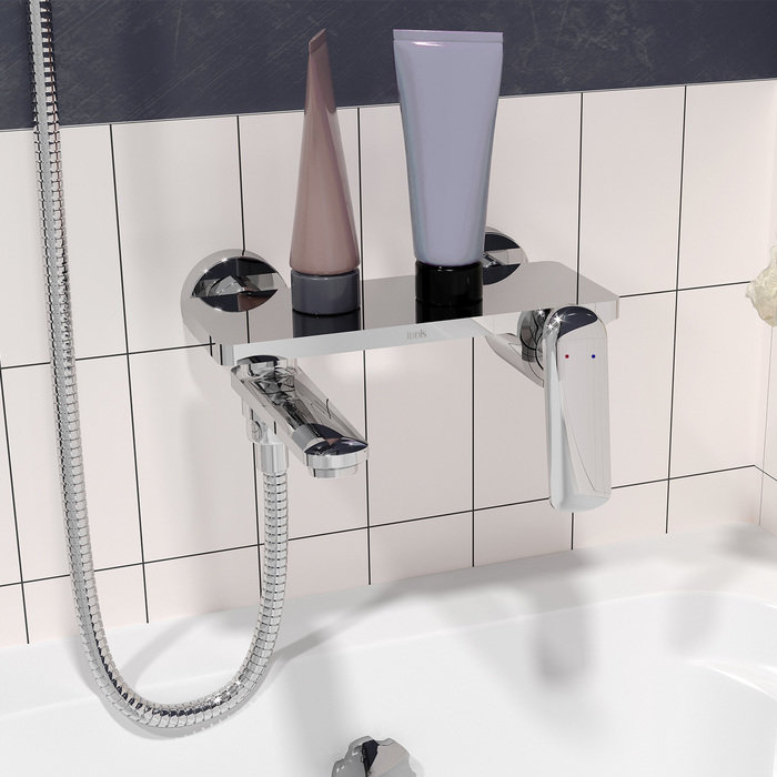 Смеситель Dash моментально приковывает взгляд своим оригинальным дизайном и монолитным корпусом, внешне напоминающим полку – на нем будет удобно разместить банные принадлежности. Необычен не только внешний вид, но и ручка управления смесителем – стильная и эргономичная, она удобно ложится в руку, делая управление более комфортным. Смеситель будет органично смотреться в интерьере в стиле минимализм или модерн, его также можно удачно обыграть и в интерьере классической ванной.