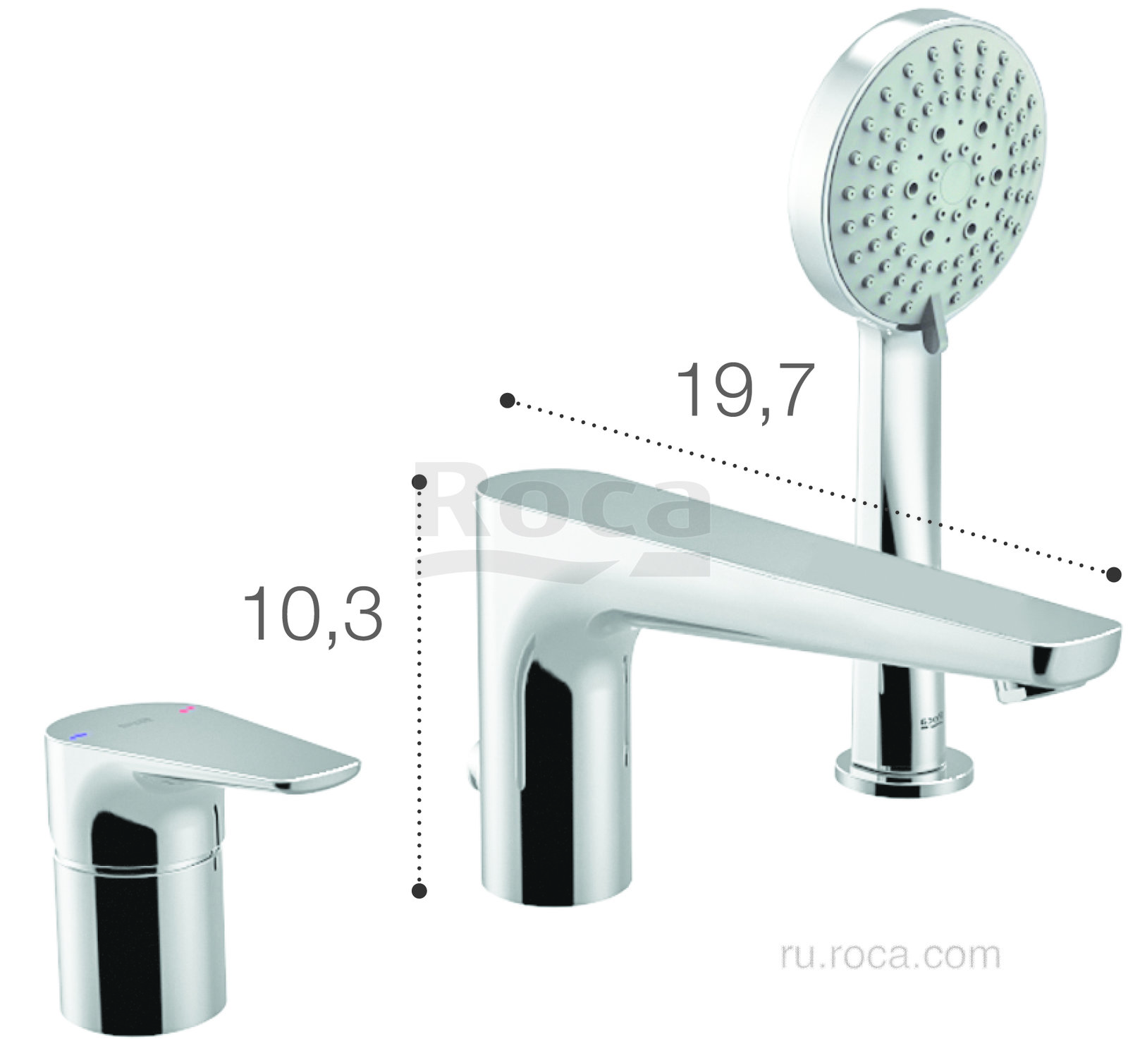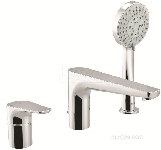 Roca Atlas Смеситель однорычажный на край ванны на три отверстия с ручным душем и шлангом, хром
