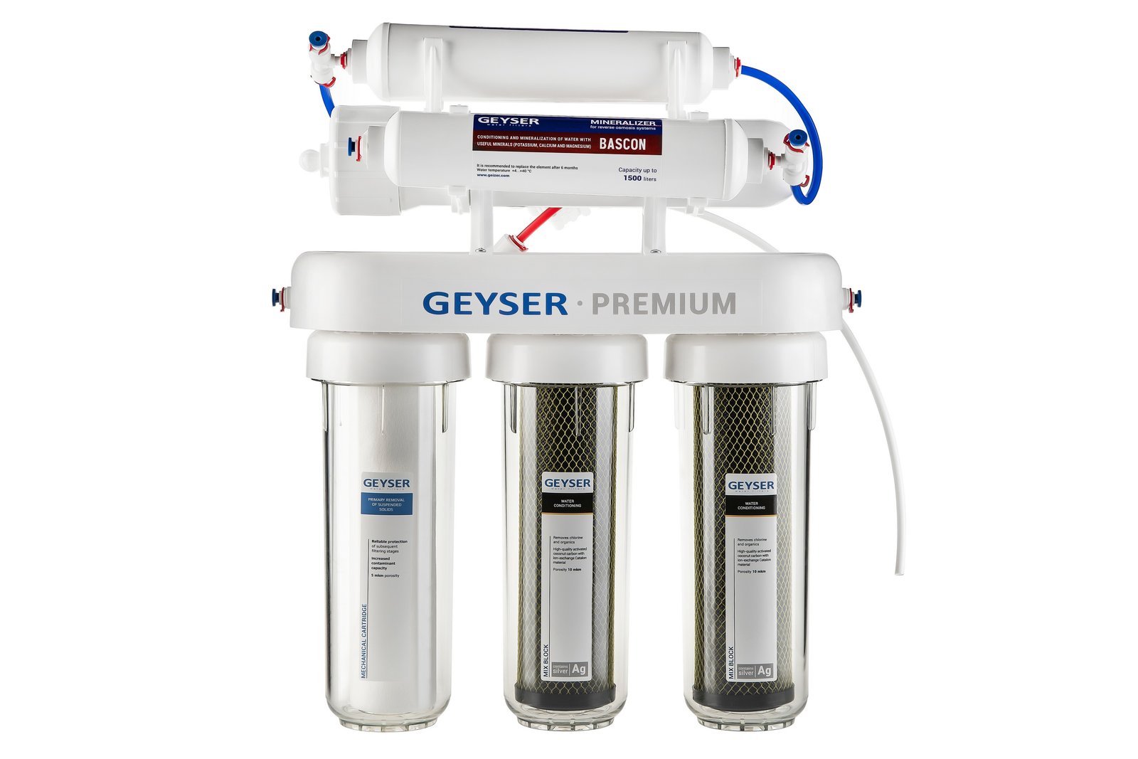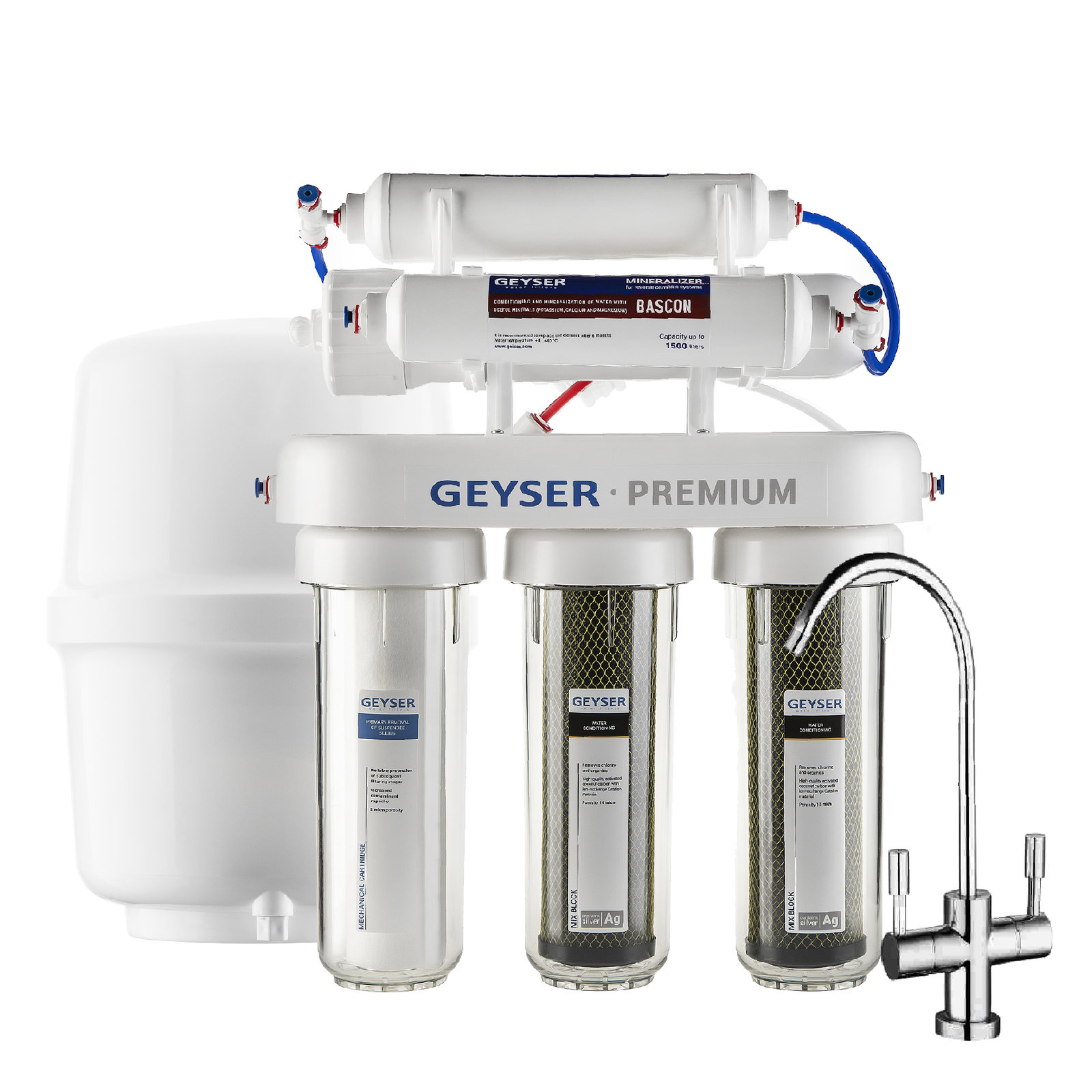 Система обратного осмоса Гейзер Премиум используется для доочистки водопроводной воды от вредных примесей, таких как железо, бактерии, хлорорганические и органические примеси, хлор, тяжелые металлы, нитраты, механические частицы, избыток солей жесткости, а также для корректировки ее минерального состава, что делает воду абсолютно