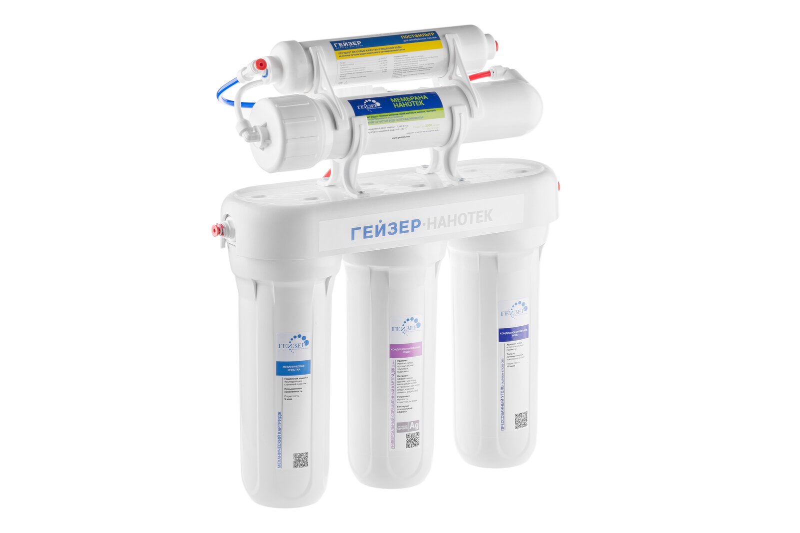 Гейзер Нанотек — это мембранный фильтр, конструктивно схожий с системами обратного осмоса. Основным его отличием является мембрана. Размер её пор в 0,001 мкм находится посередине между порами обратноосмотических и ультрафильтрационных мембран. Это позволяет получить воду высокой степени очистки, но в то же время избежать её полного обессоливания. Гейзер Нанотек способен снизить содержание солей жесткости в воде на 80%, что обеспечит отсутствие накипи в чайниках, а также защитит утюги, кофемашины и другую бытовую технику.