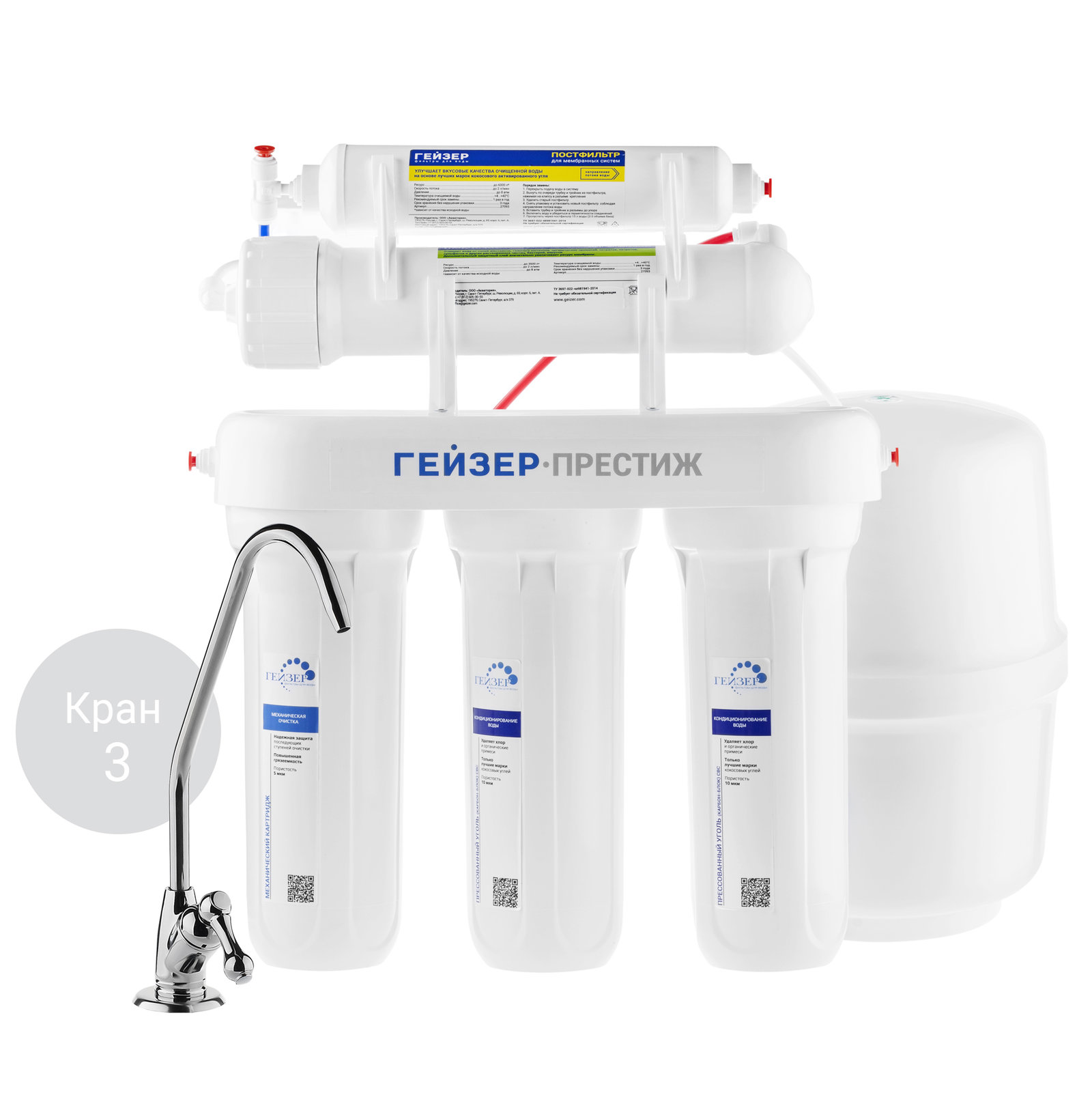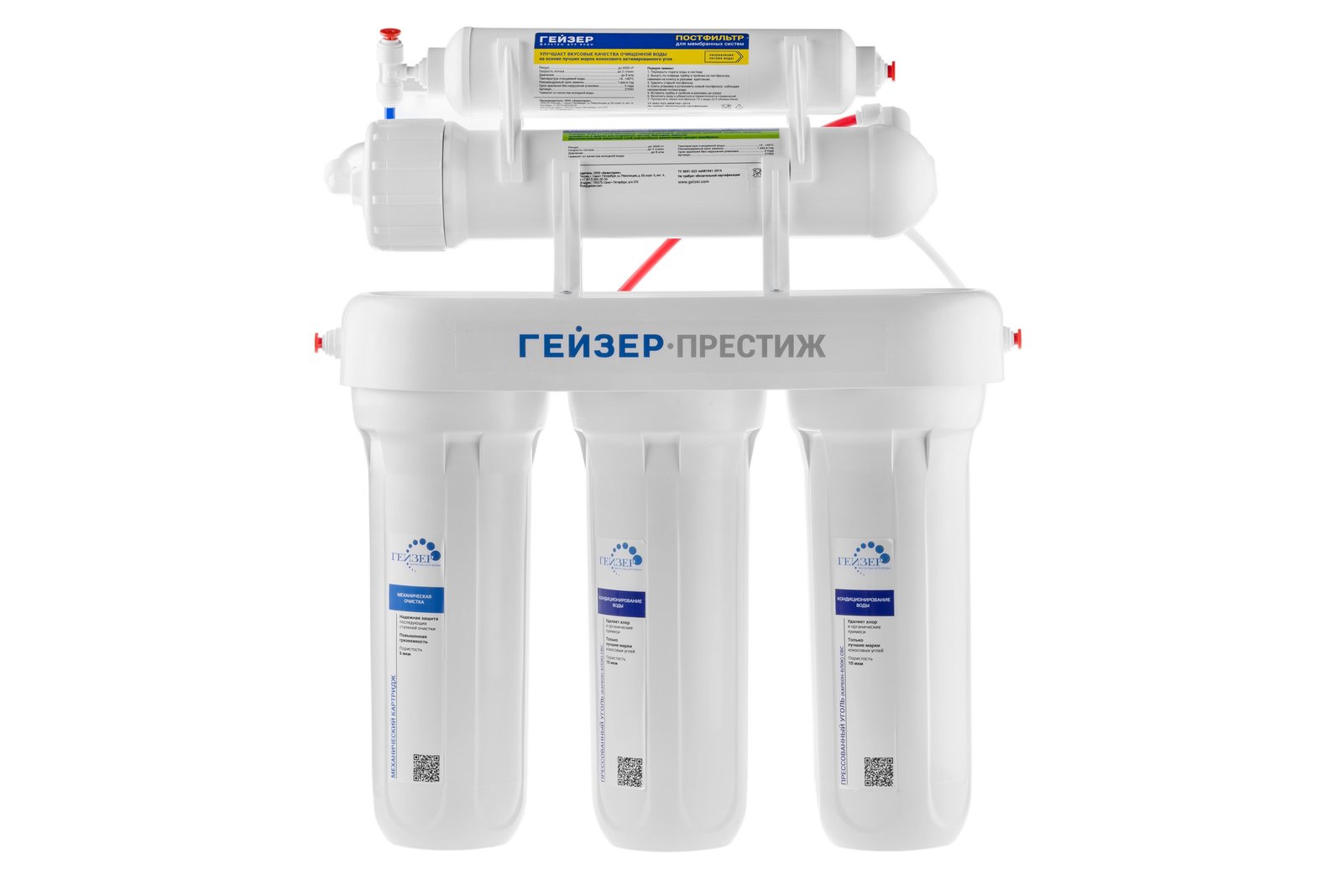 Технология обратного осмоса, использованная в фильтре Гейзер Престиж, заключается в фильтрации воды через полупроницаемую мембрану. Размеры пор мембраны настолько малы, что пропускают только молекулы воды. Размер молекул большинства примесей, а также бактерий и вирусов значительно больше молекул воды, поэтому они не проходят через мембрану. Система работает при давлении в подводящей магистрали не менее 3 атм.