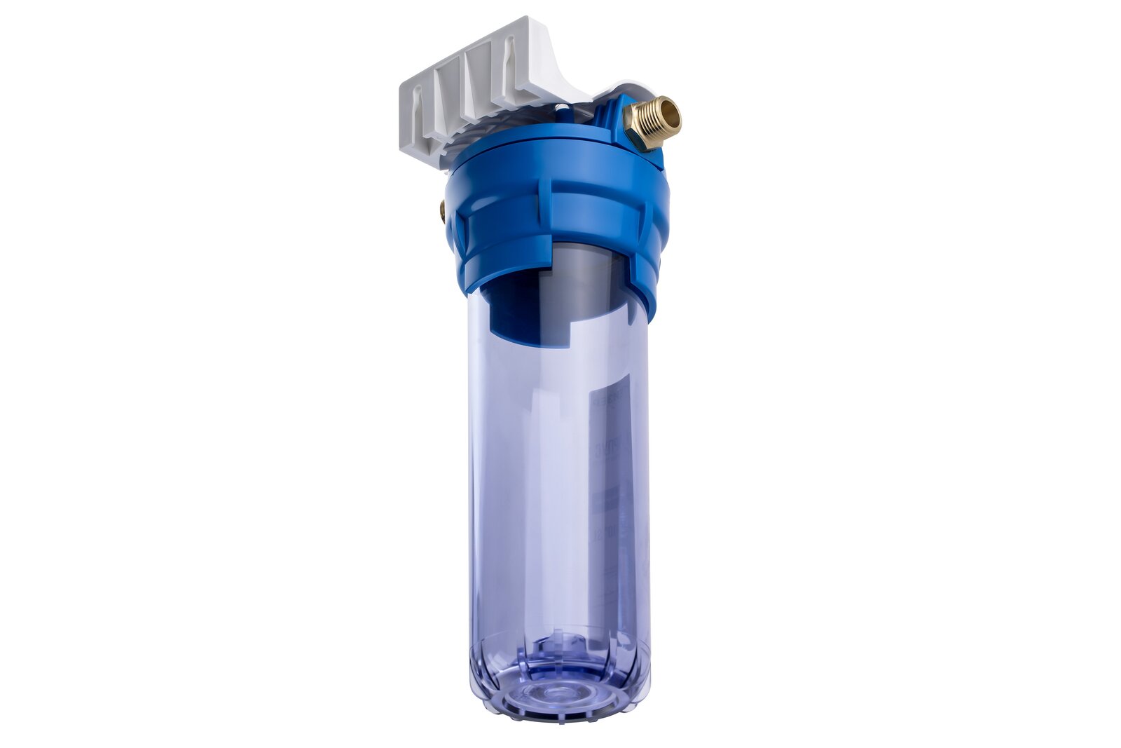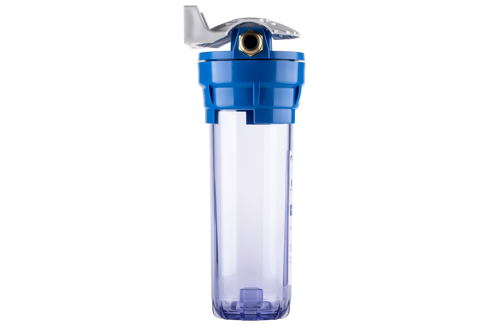 Корпус Гейзер 10SL 1/2", прозрачный изготовлен из прочного прозрачного полипропилена. Крышка корпуса – из синего полипропилена с металлическими ниппелями, скоба - пластмассовая. Накидная гайка на корпусе значительно облегчает установку и замену картриджа. Корпус рассчитан на работу под давлением и установку на входе в систему холодного водоснабжения. В производстве корпусов используются материалы пищевого класса.