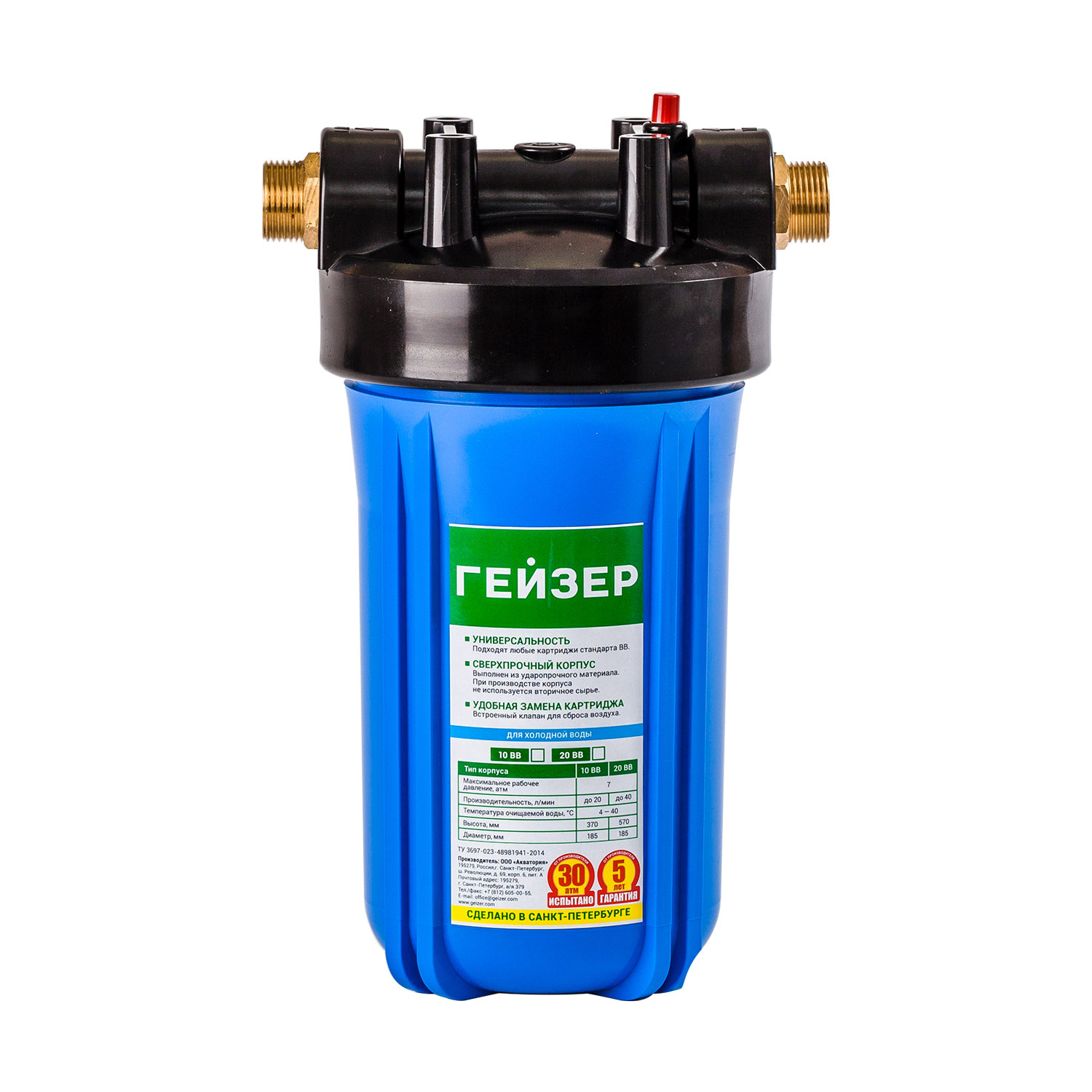 Корпус Гейзер 10BB изготовлен из синего полипропилена; крышка корпуса – черный полипропилен в комплекте с латунными ниппелями. Корпус рассчитан на работу под давлением и установку на входе в систему холодного водоснабжения. В производстве корпусов используется только первичное сырье пищевого класса.