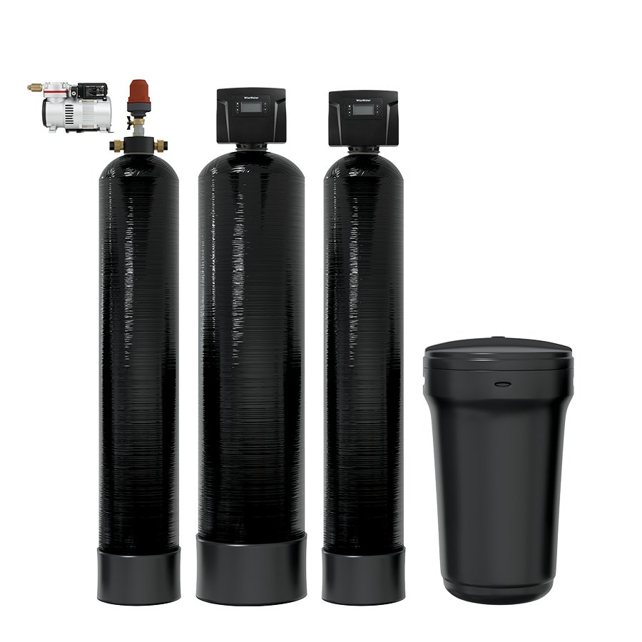 В состав оборудования входит: латунный грязевой фильтр, аэрационная колонна со встречными турбулентными потоками, безмасляный малошумный воздушный компрессор с регулятором расхода воздуха, автоматическая система управления работой компрессора, автоматический безреагентный фильтр-обезжелезиватель, автоматический фильтр-умягчитель с баком для соли, регулятор жёсткости воды, манометры, термочехлы, все необходимые фильтрующие загрузки.
